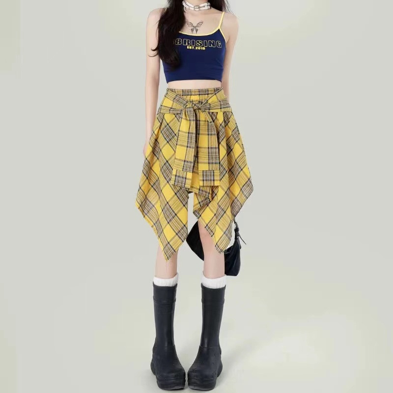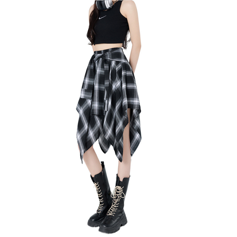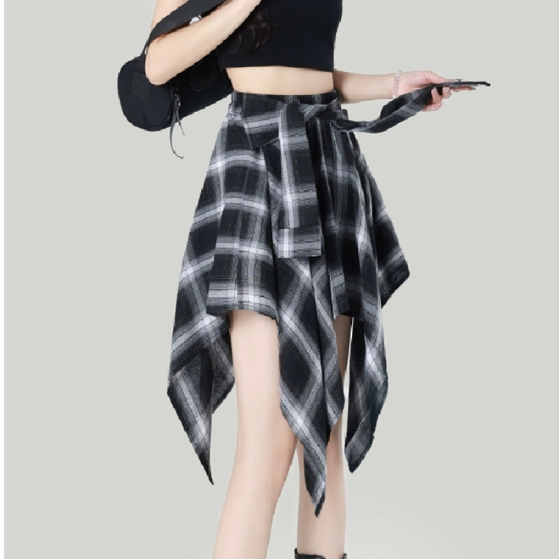 不规则绑带半身裙女夏季设计感小众格子a字短裙