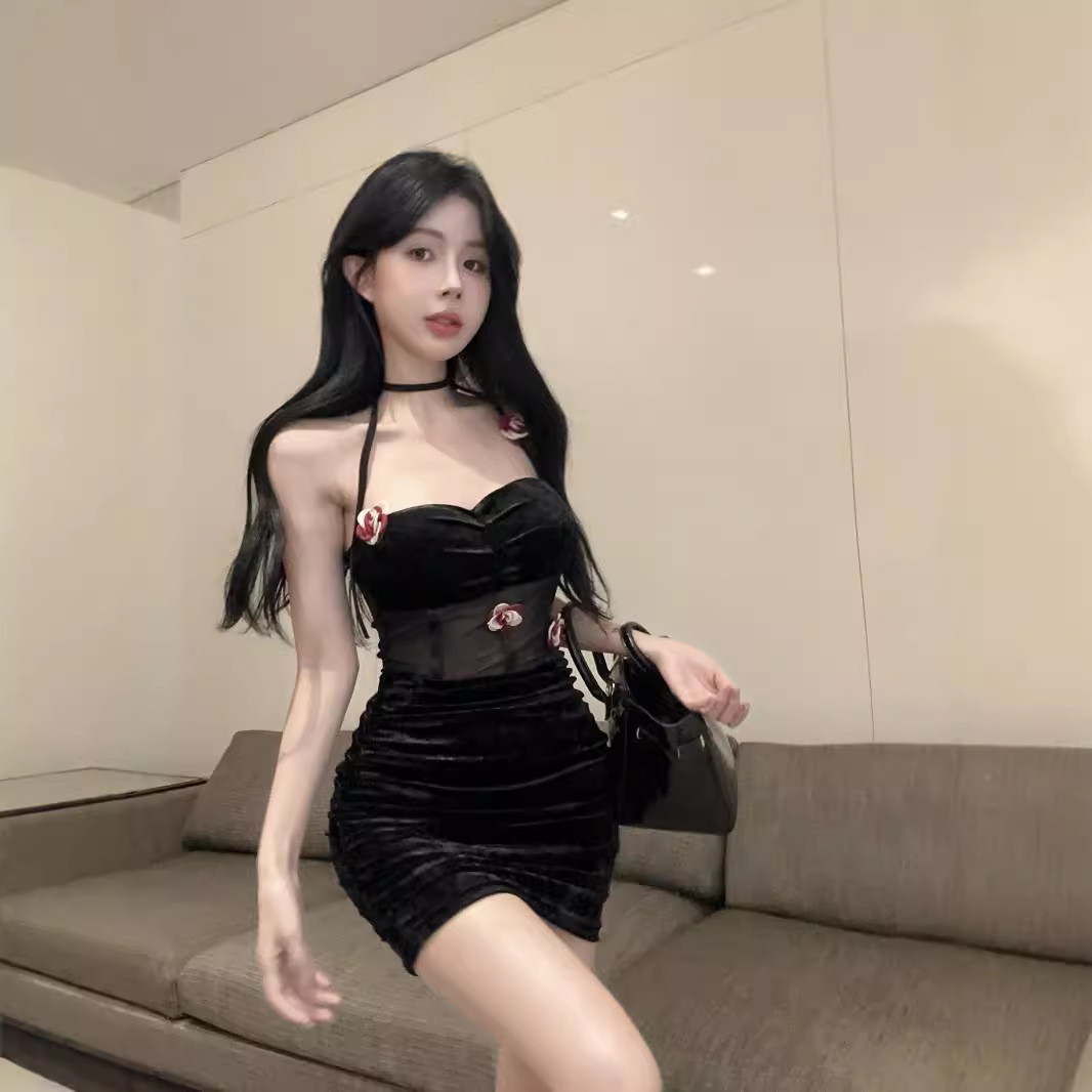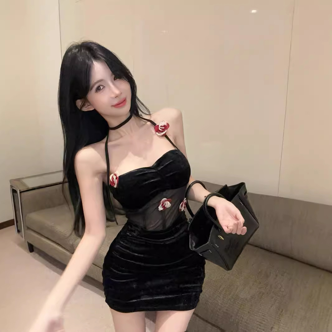夜店风辣妹纯欲时尚紧身抹胸礼服立体花朵设计感包臀钻石绒连衣裙