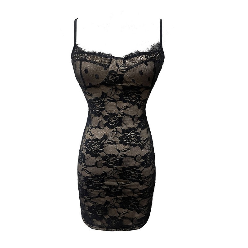 性感风夜店纯欲辣妹蕾丝吊带V领低胸假透肉短裙紧身包臀连衣裙女