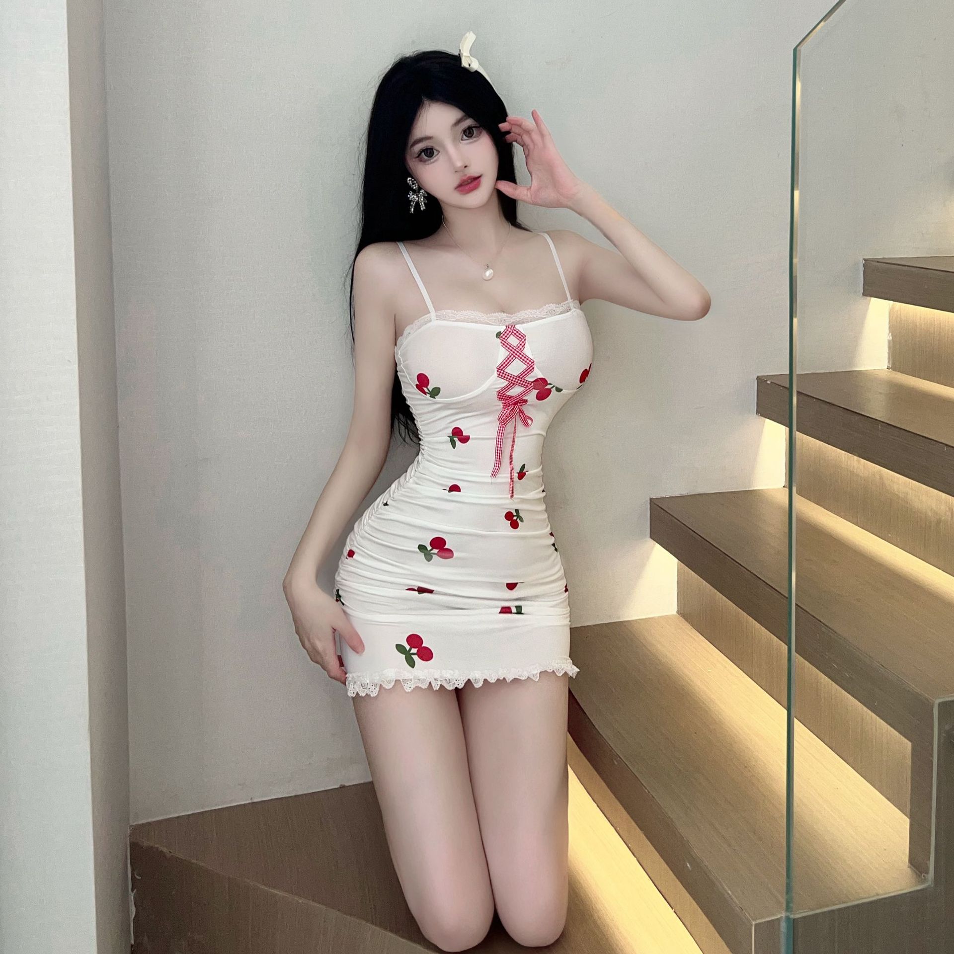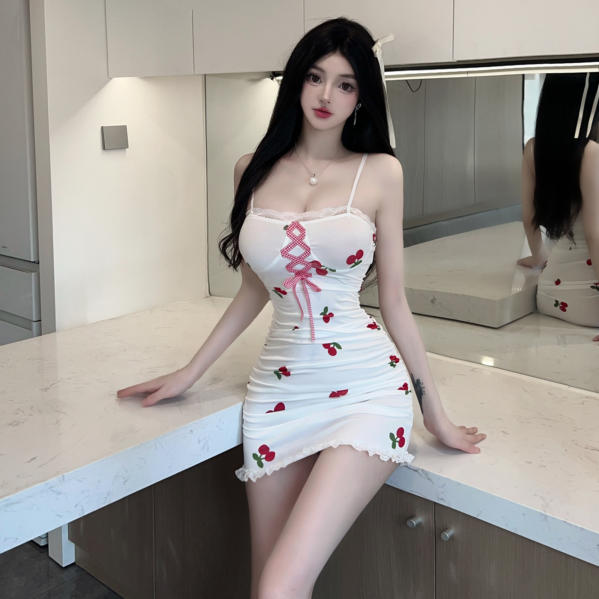 设计感系带甜辣风吊带纯欲辣妹印花紧身包臀可爱连衣裙女优雅蕾丝