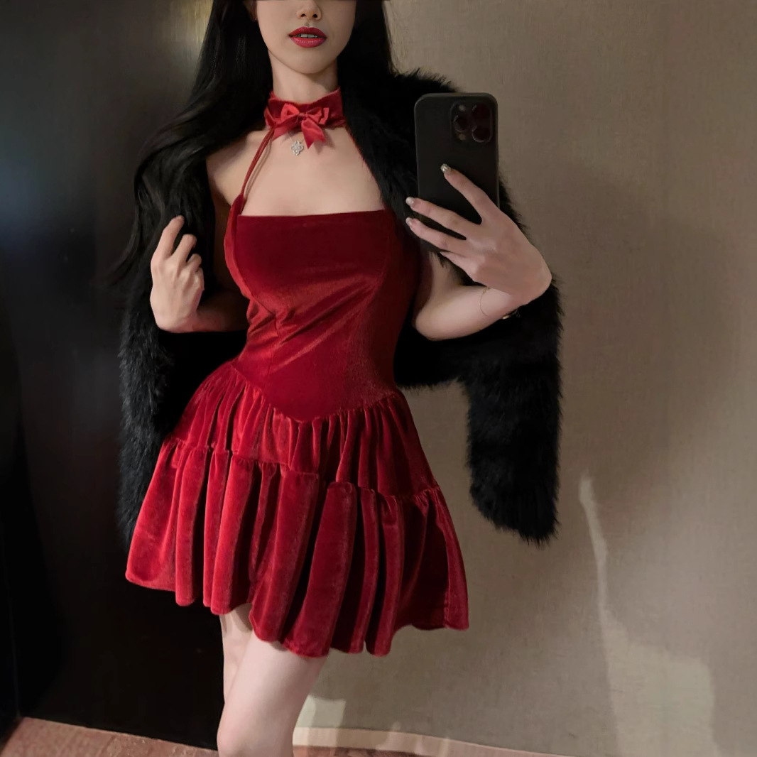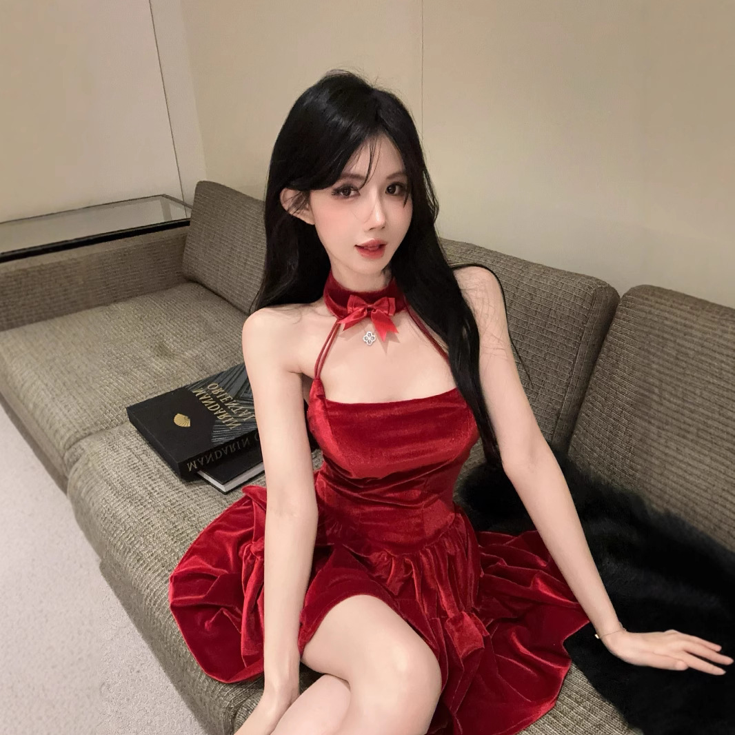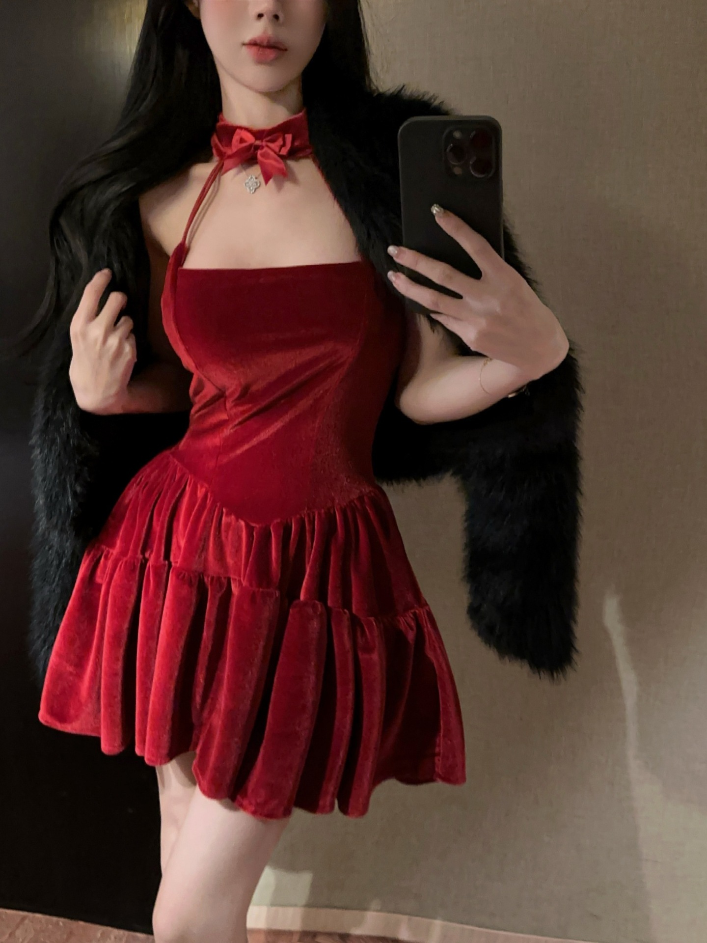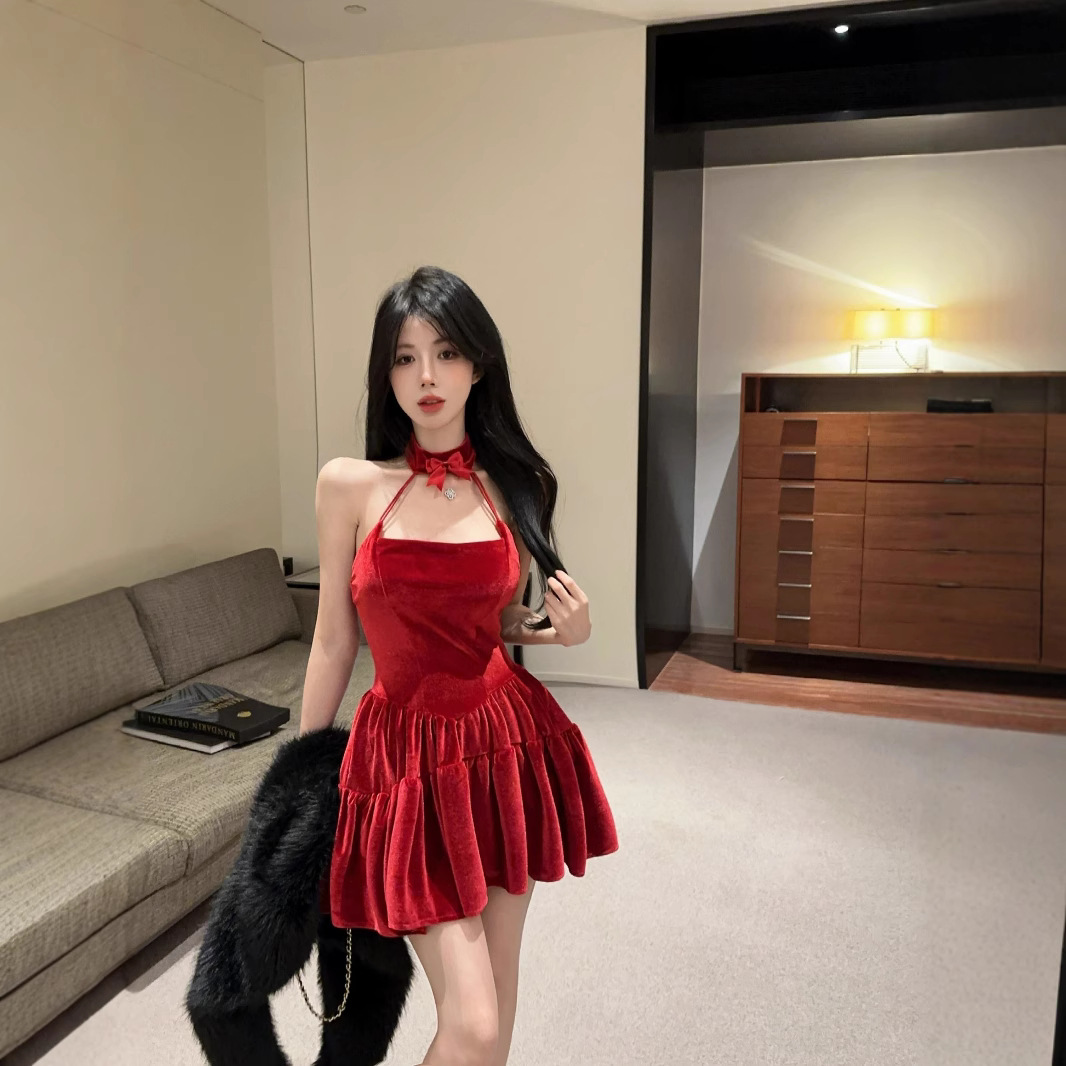 圣诞红色新年宴会高级感丝绒挂脖设计感吊带大摆性感辣妹连衣裙女