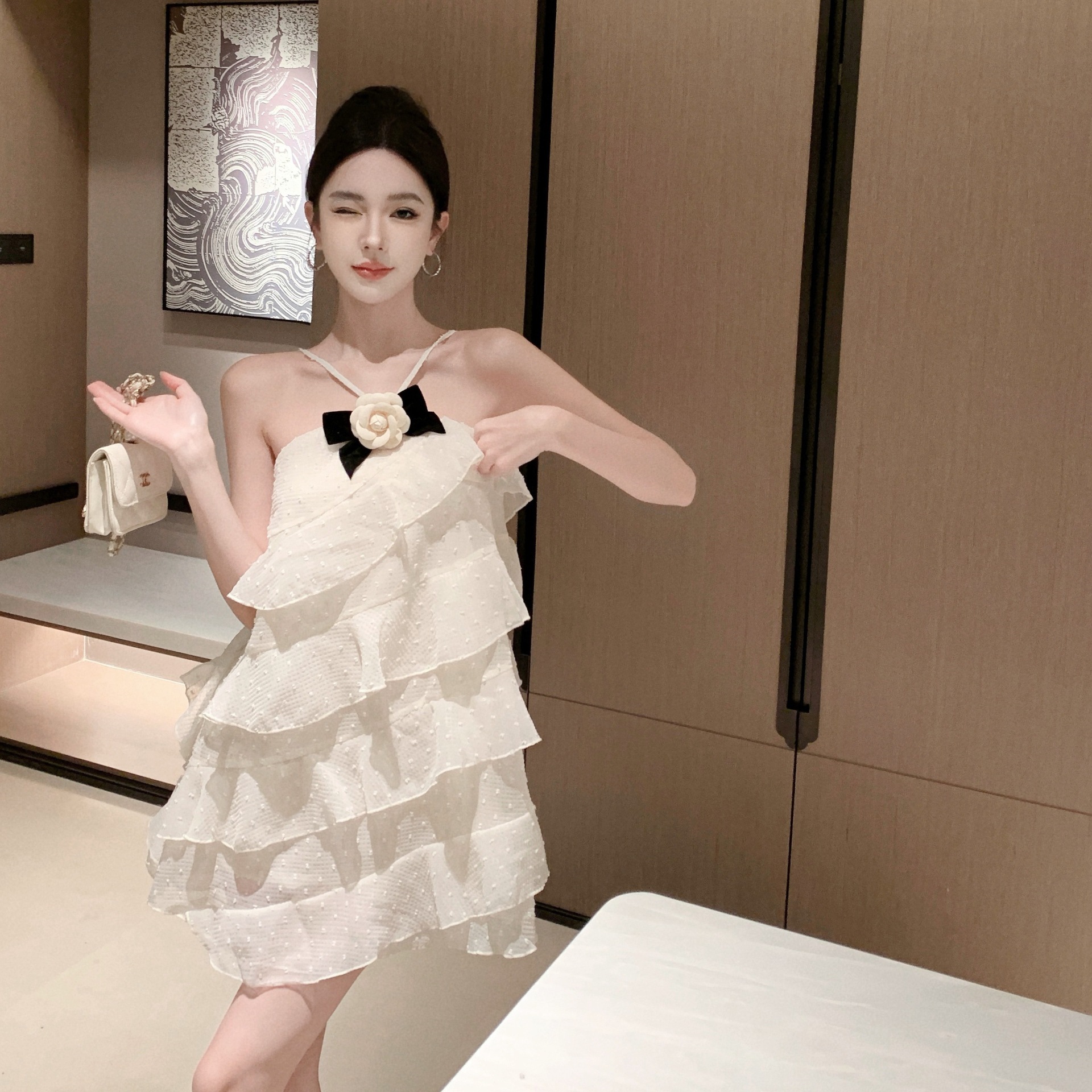 夏季性感波点垂感无袖挂脖抹胸连衣裙短款高级感蛋糕裙