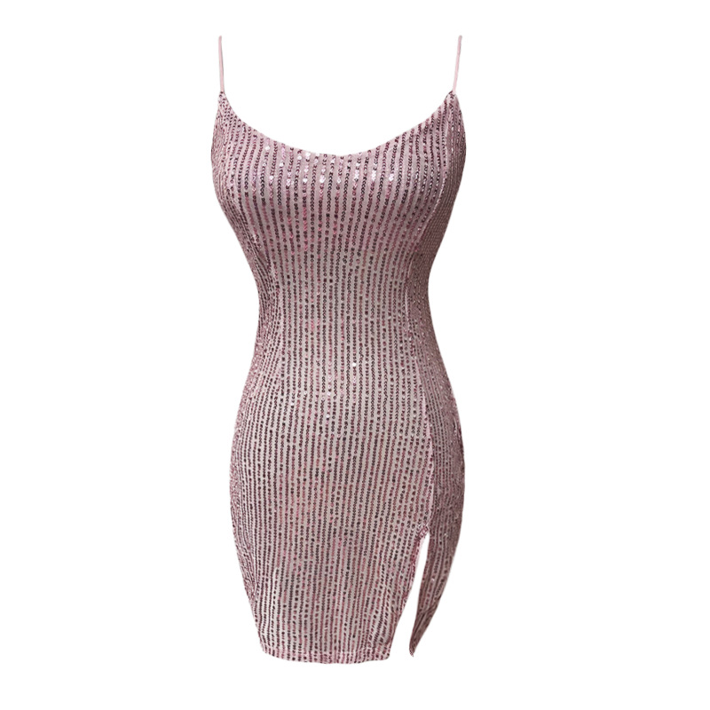 性感辣妹夜店单层透视粉色亮片低胸v领吊带短裙修身包臀连衣裙女
