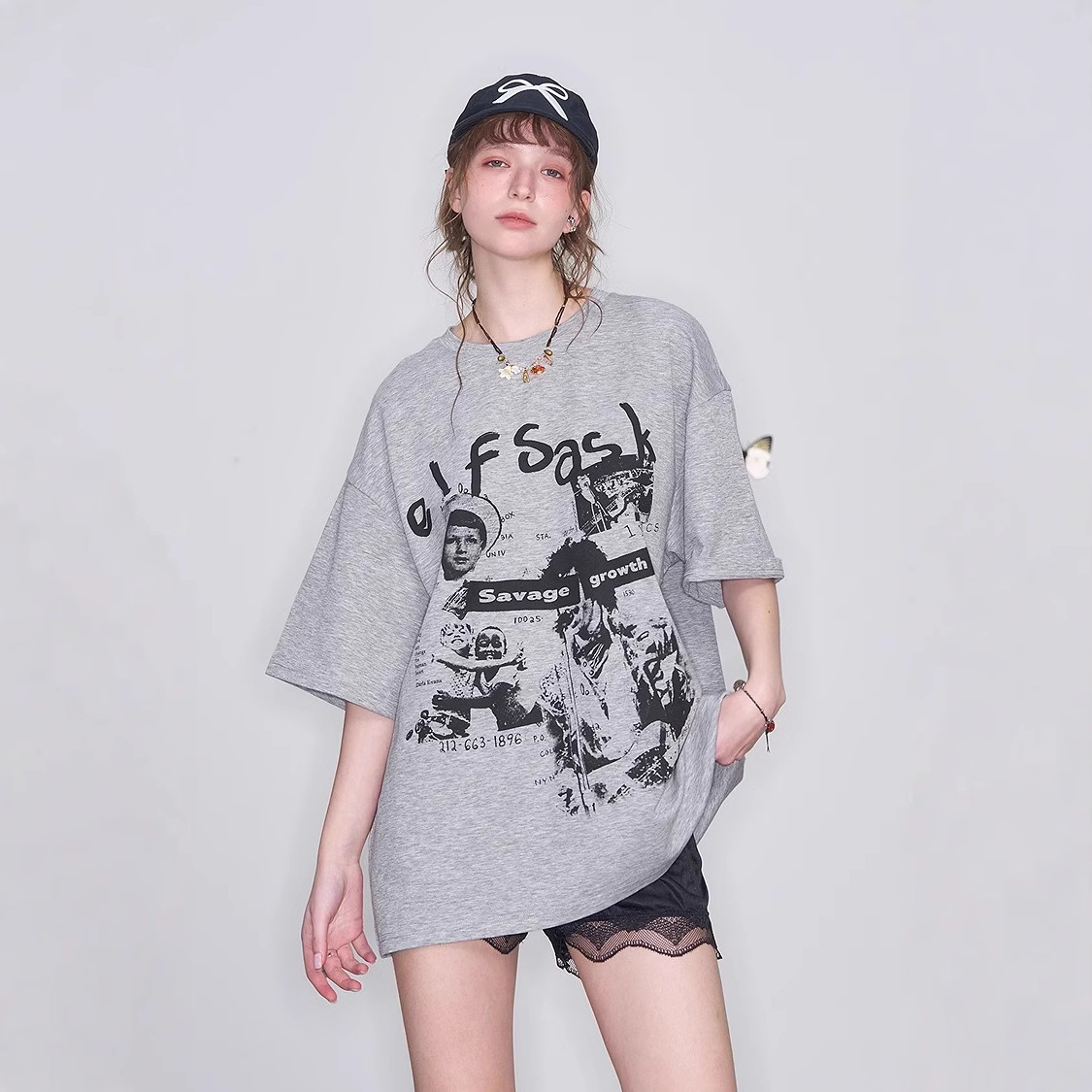 美式复古印花灰色短袖t恤女2025春季新款宽松休闲上衣