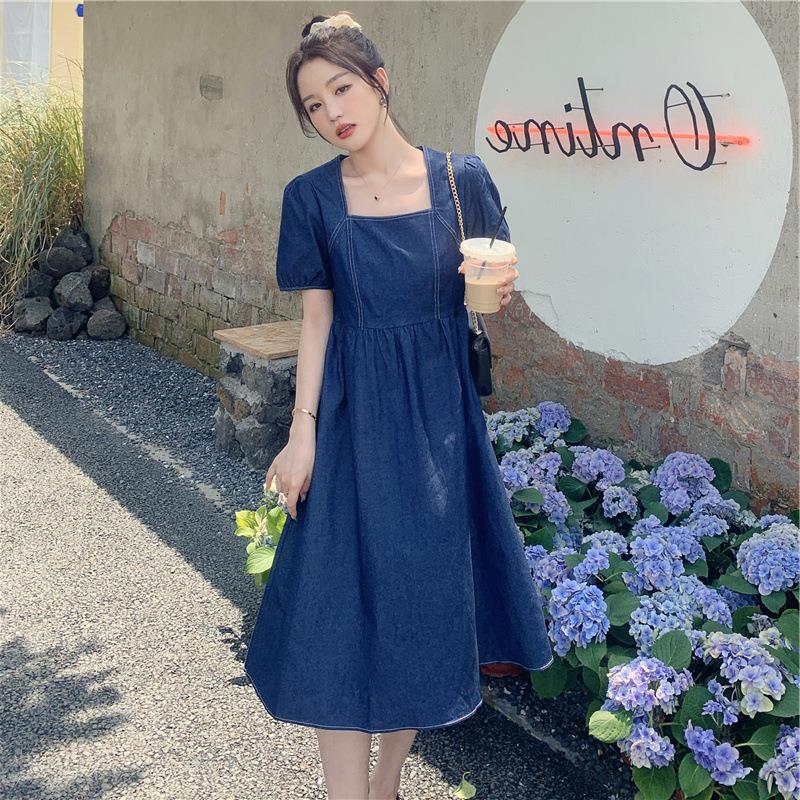 实拍洋气复古明线方领小个子显瘦高腰泡泡袖减龄中长牛仔蓝连衣裙