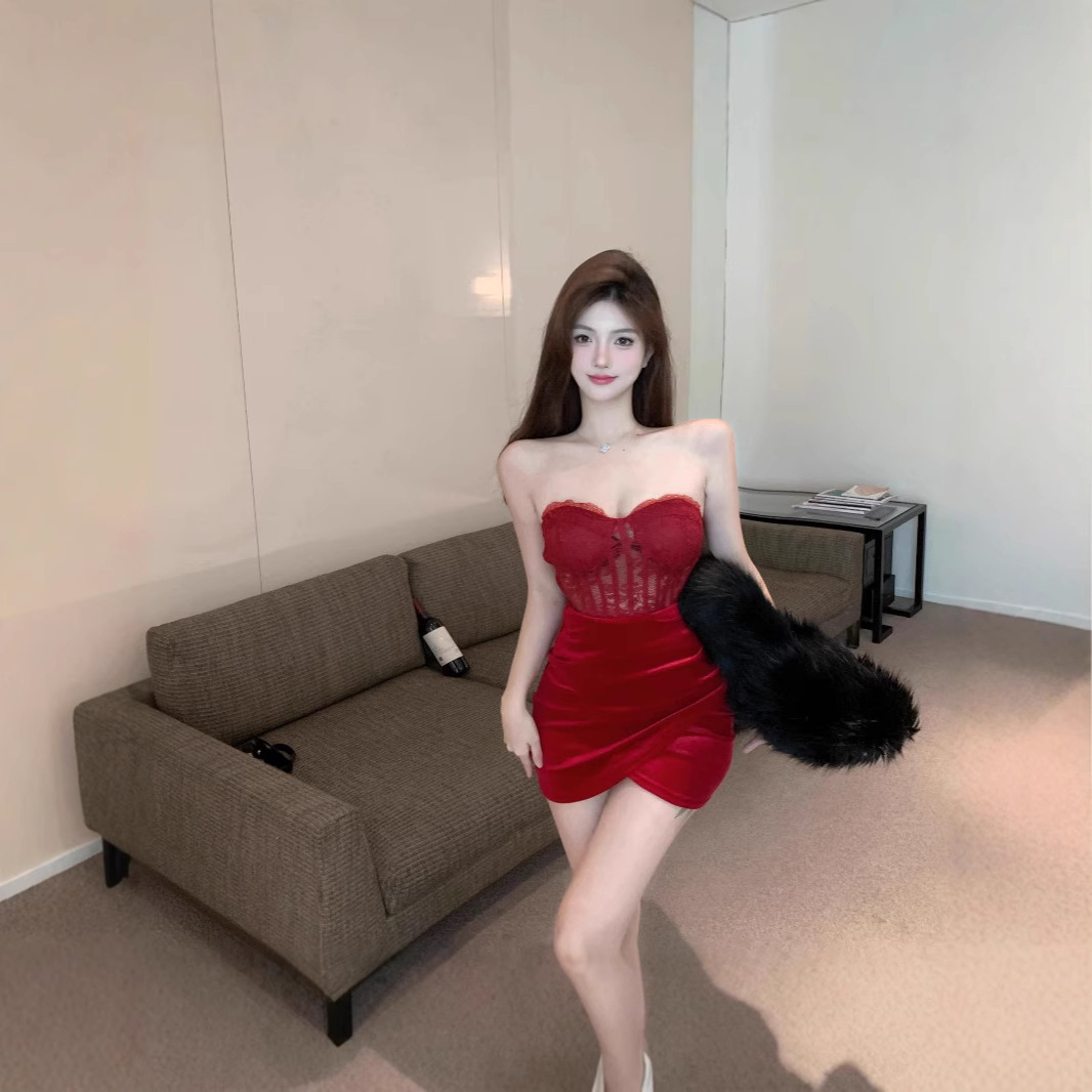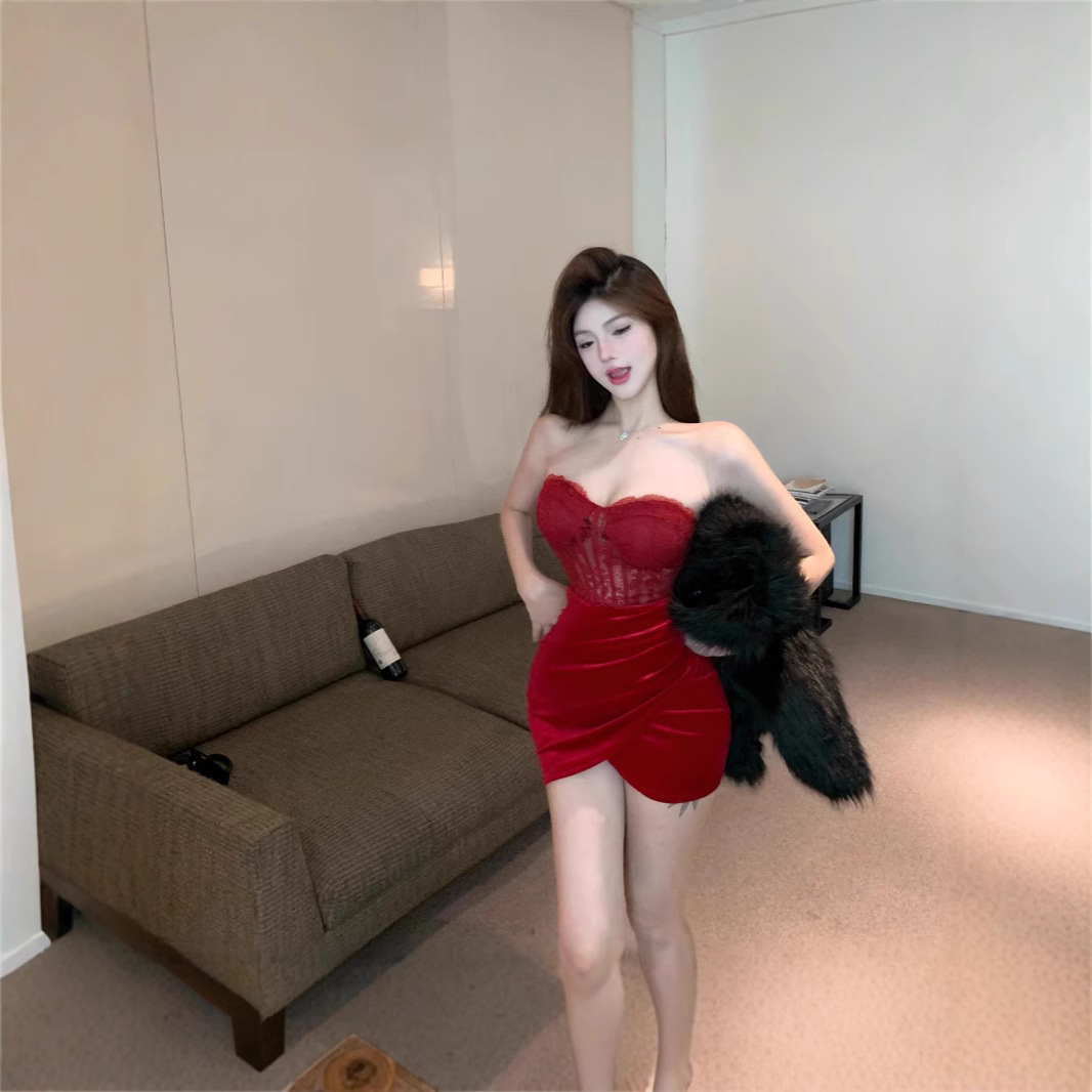 设计感气质纯欲蕾丝镂空拼接辣妹性感红色圣诞抹胸裹胸礼服连衣裙
