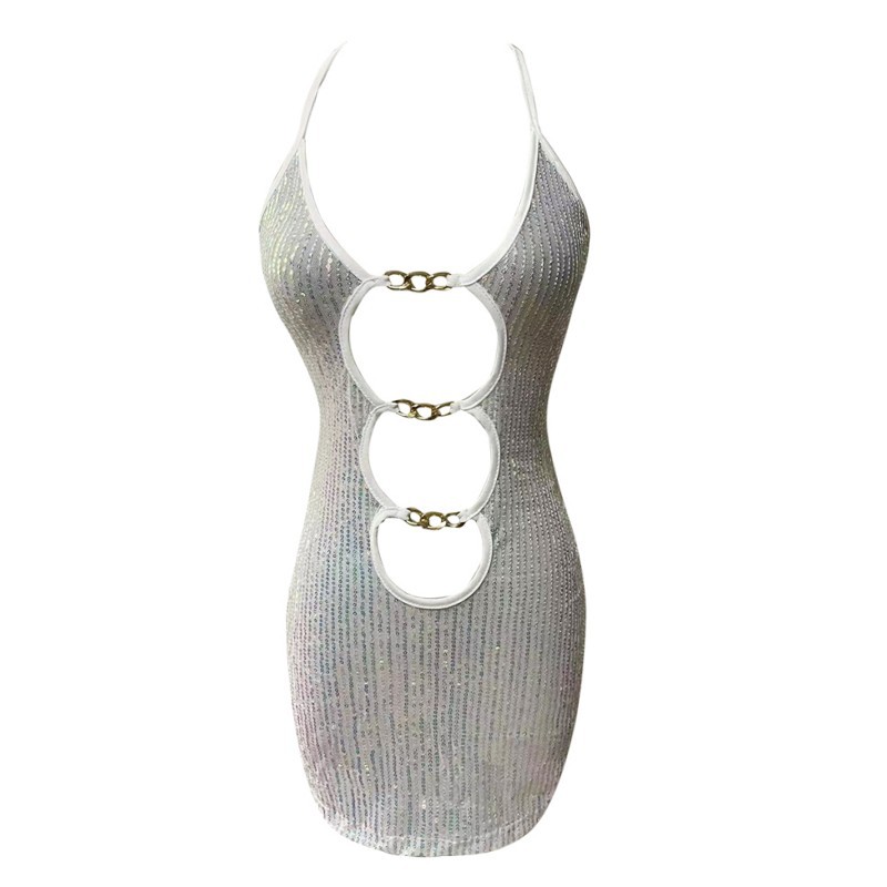 欧美夜店性感辣妹透视镂空露胸金属链条亮片短裙紧身包臀连衣裙女