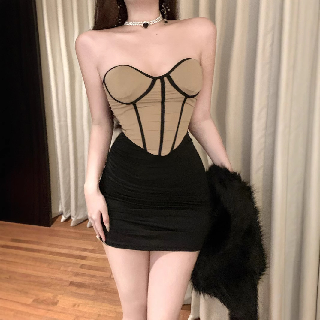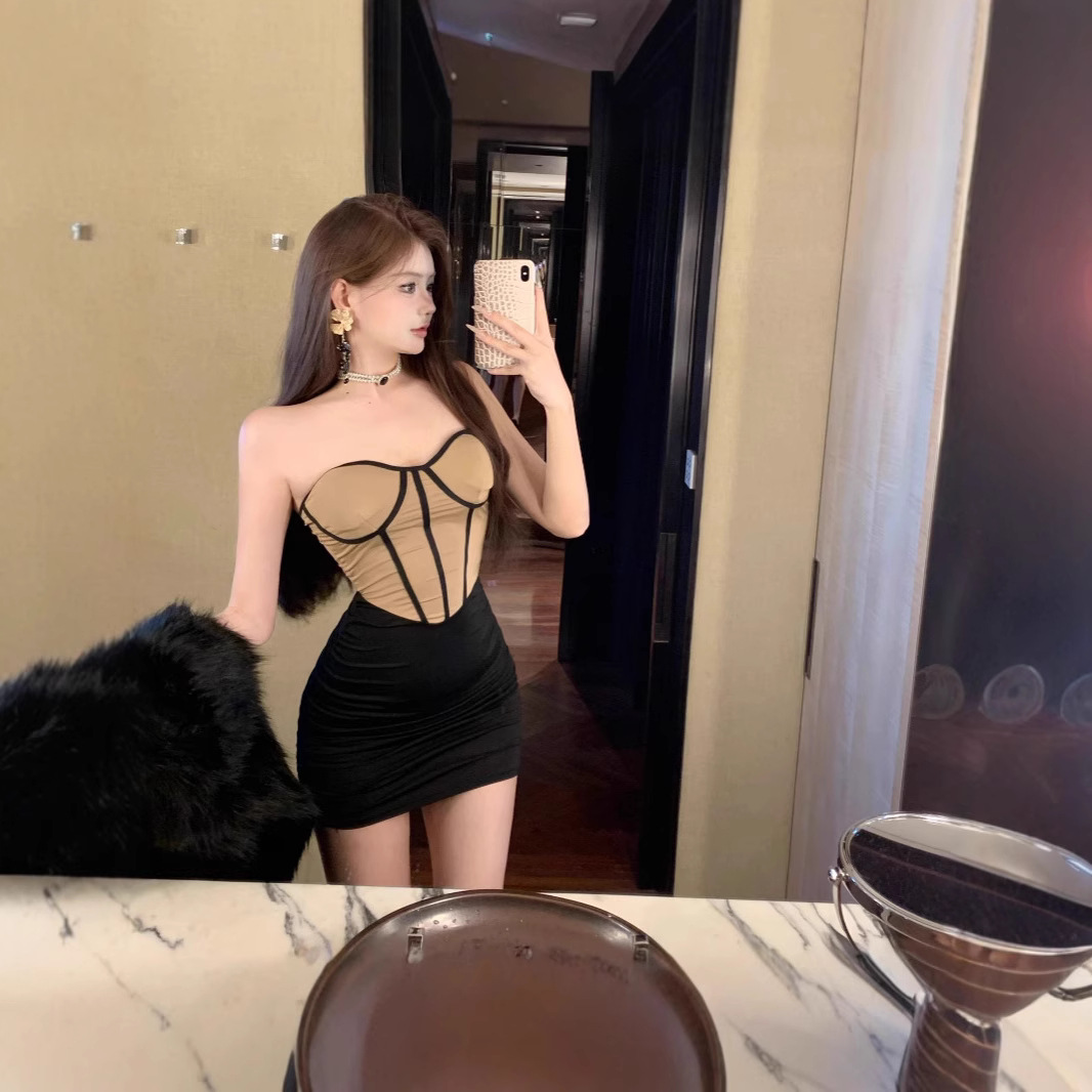 低胸露背设计感性感夜店辣妹带胸垫包臀裙时尚紧身抹胸裹胸连衣裙