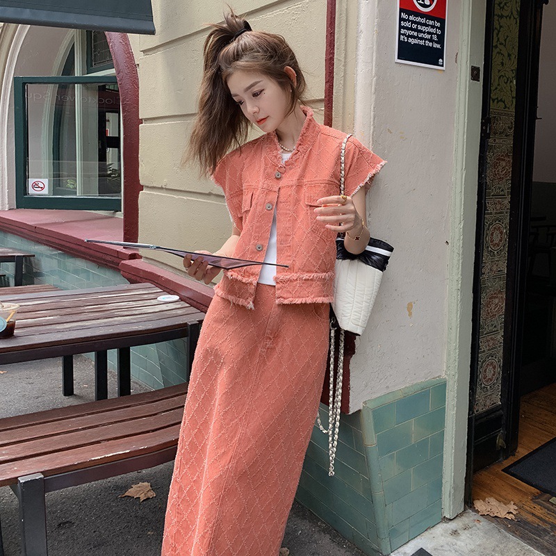 夏季粉色辣妹时尚休闲牛仔套装女高腰半身裙复古减龄两件套潮