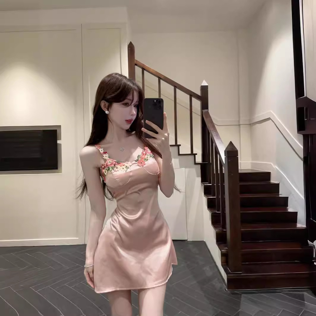 设计感网纱小红书立体花吊带修身粉色度假风小性感纯欲连衣裙显瘦