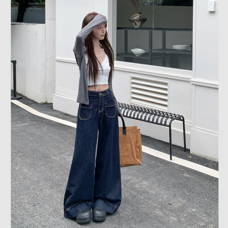 美式辣妹深蓝色阔腿牛仔裤女口袋刺绣高腰显瘦宽松直筒长裤