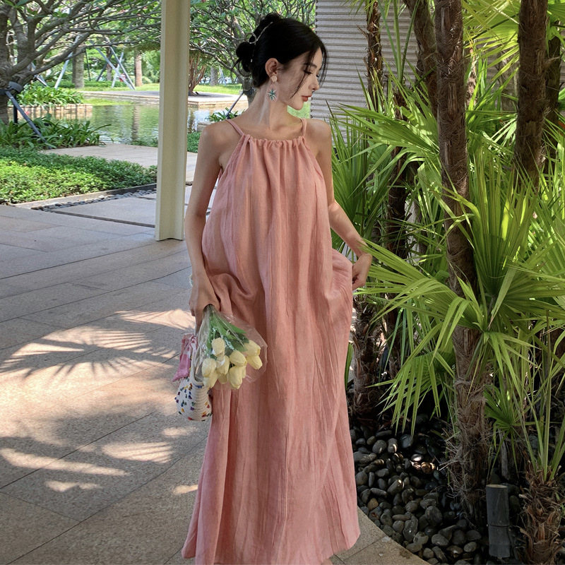 植物染亚麻吊带连衣裙女宽松显瘦大摆裙褶皱无袖削肩长裙