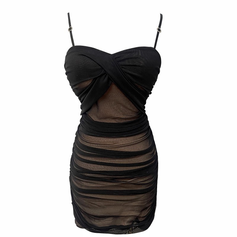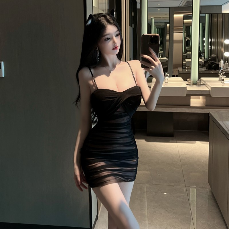 网红同款性感辣妹双层网纱肉色低胸褶皱吊带短裙紧身包臀连衣裙女