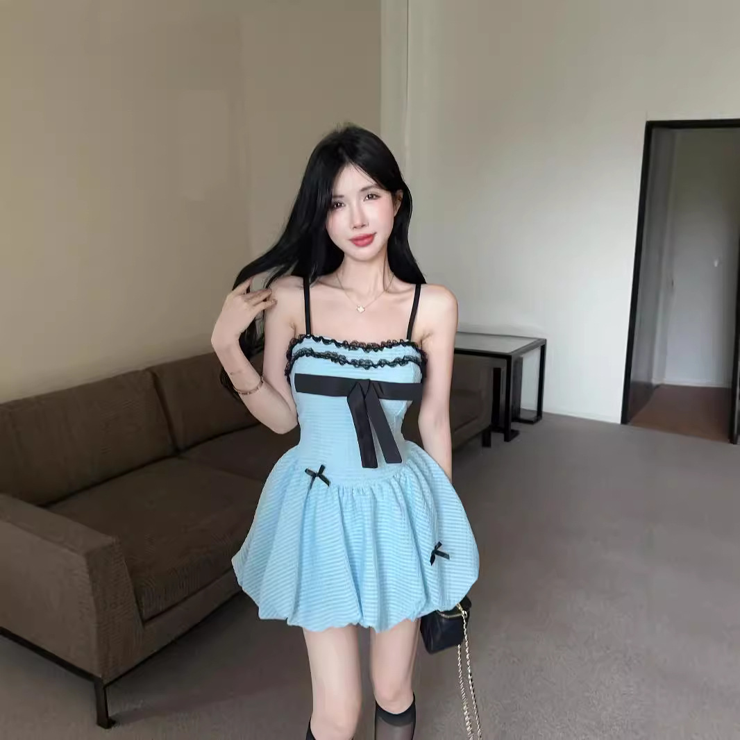 气质蕾丝花边设计感吊带纯欲辣妹花苞裙修身显瘦收腰蝴蝶结连衣裙