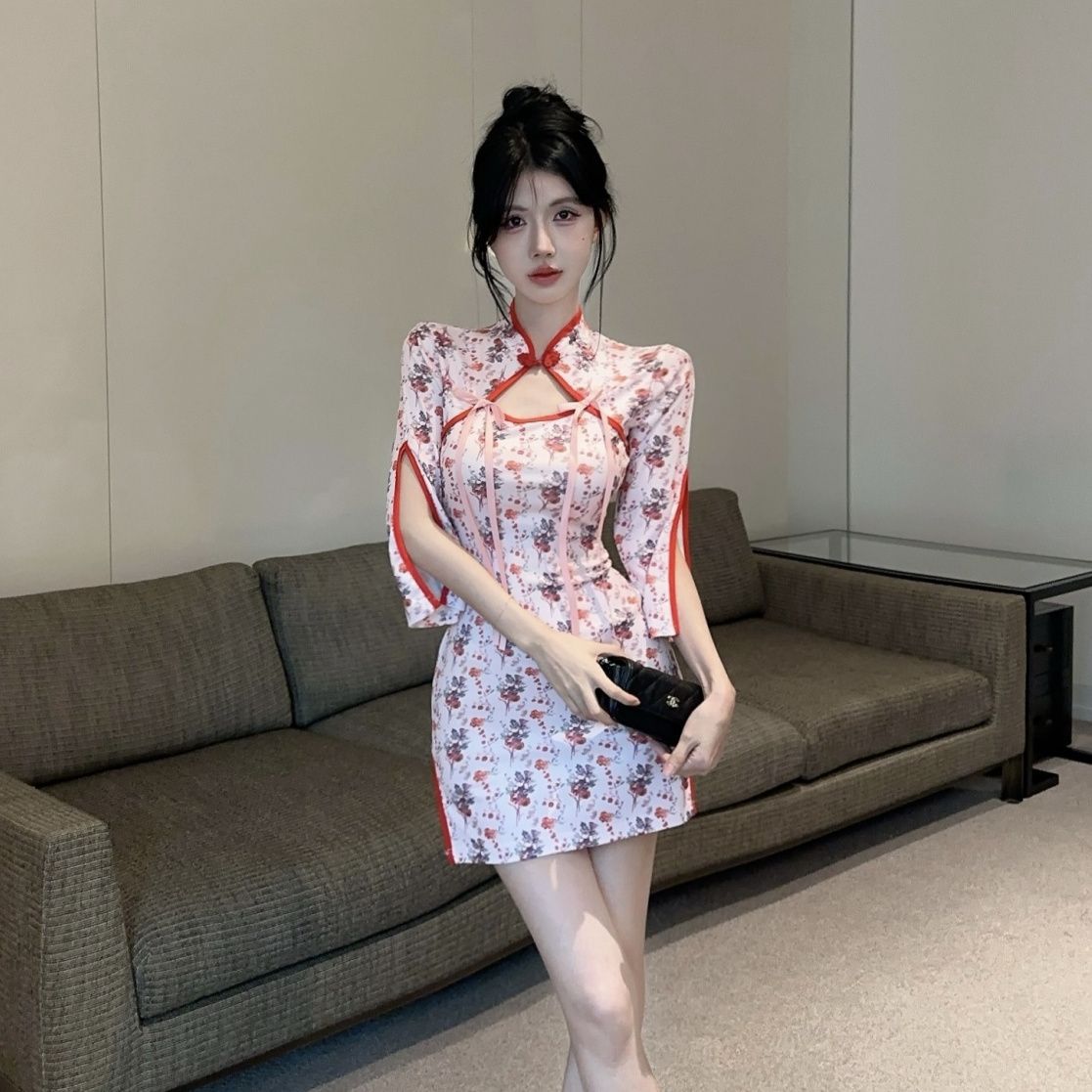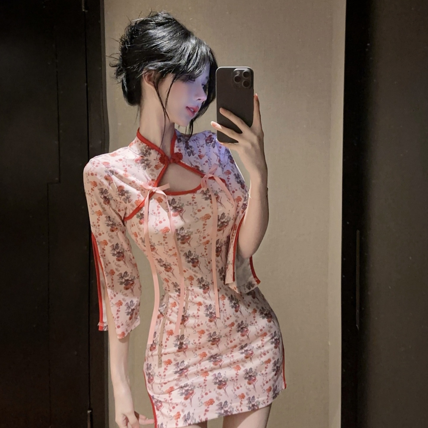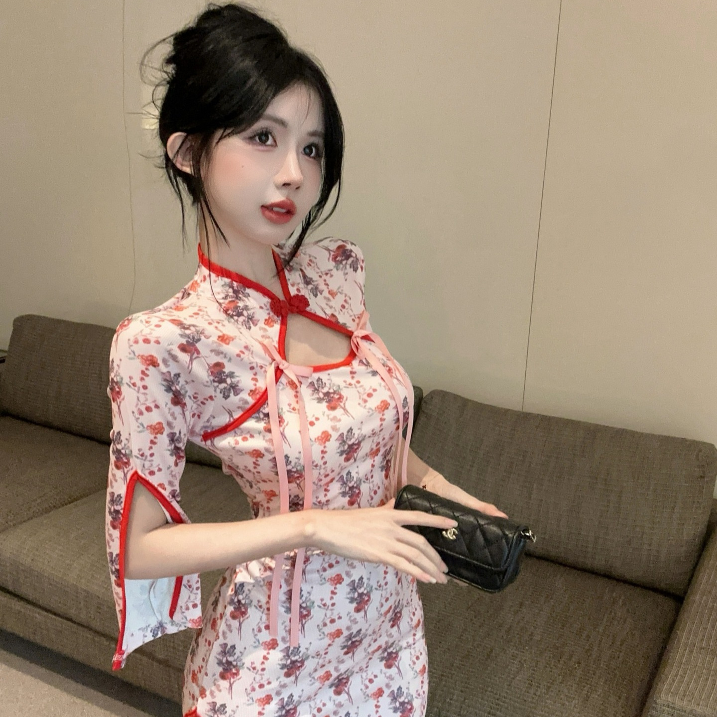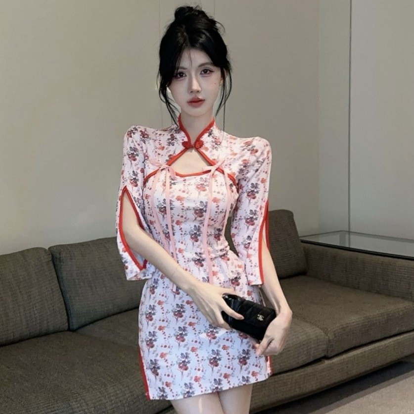 设计感气质甜美中袖开叉修身包臀辣妹时尚碎花中国风旗袍连衣裙女