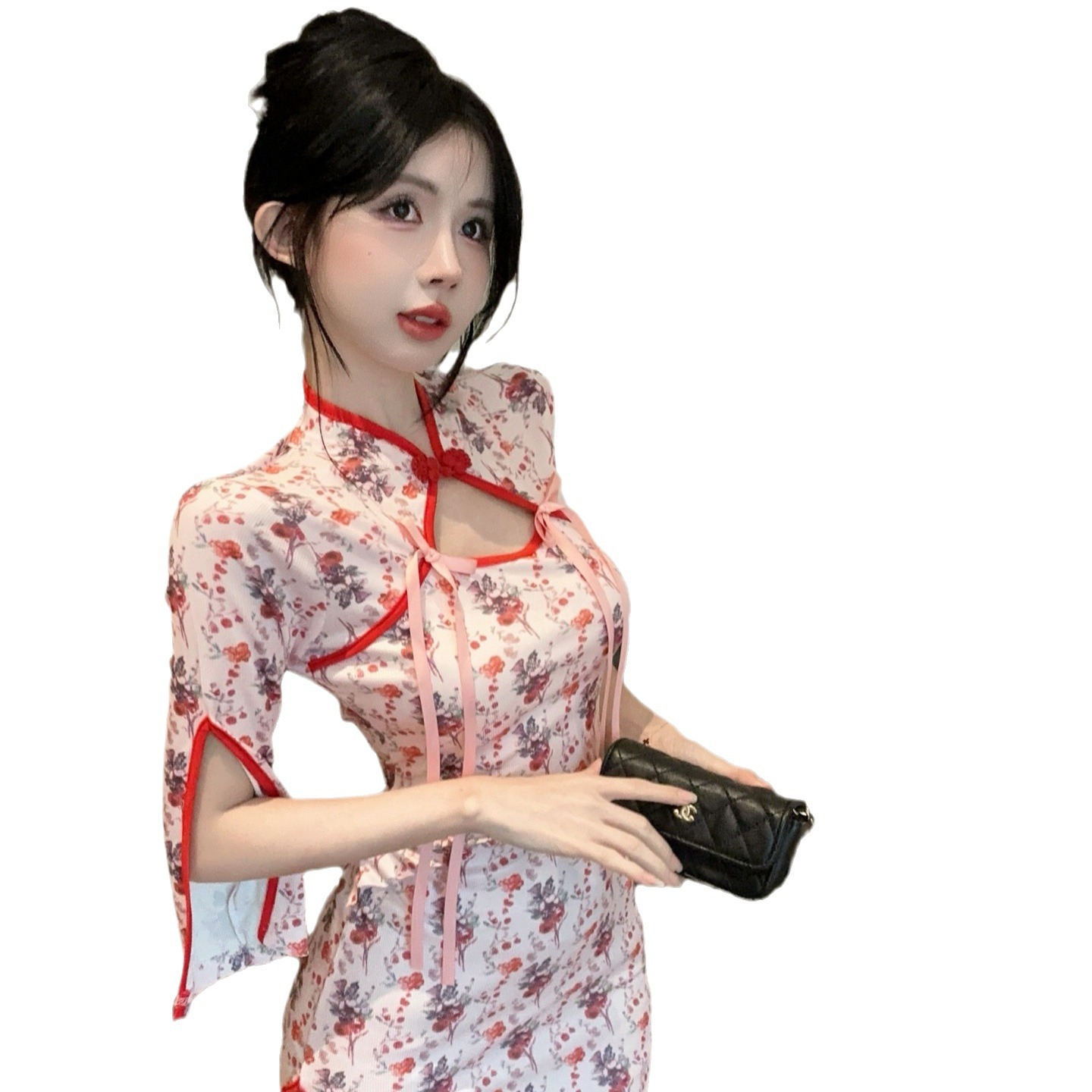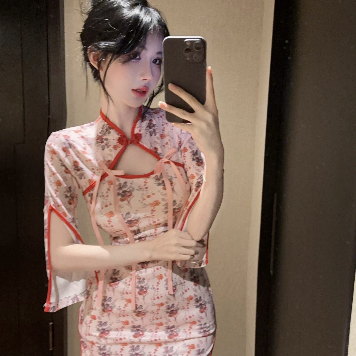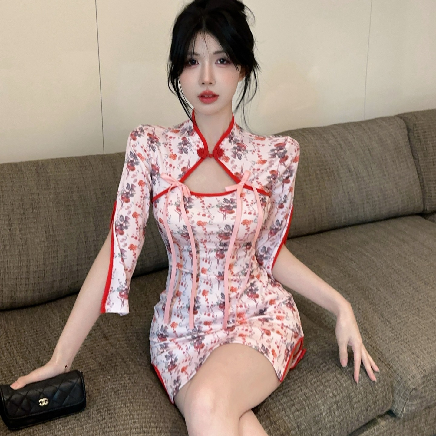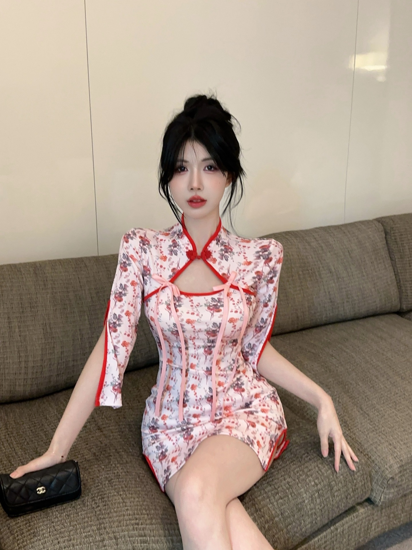 设计感气质甜美中袖开叉修身包臀辣妹时尚碎花中国风旗袍连衣裙女