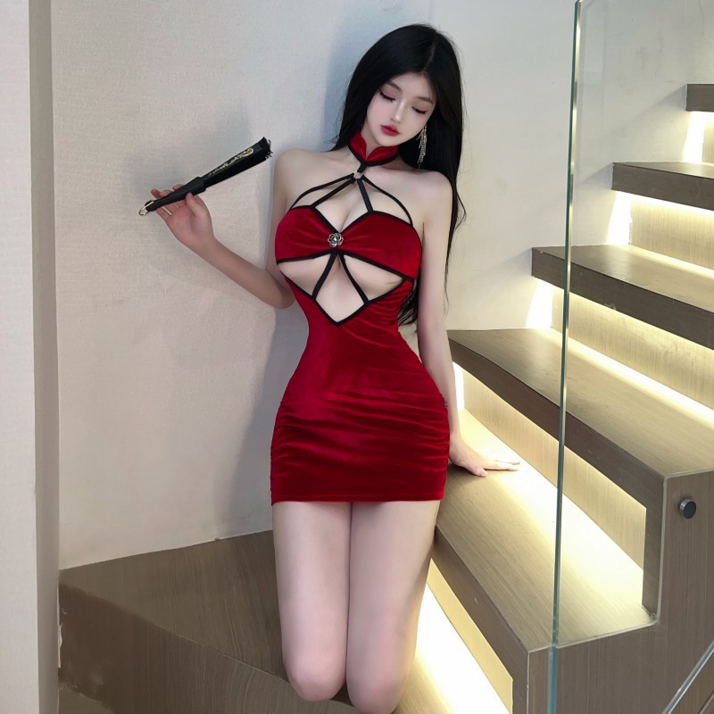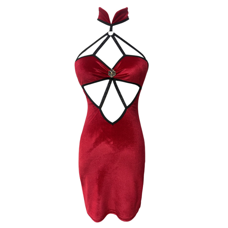 性感风夜店辣妹丝绒立领挂脖镂空露胸设计感短裙紧身包臀连衣裙女