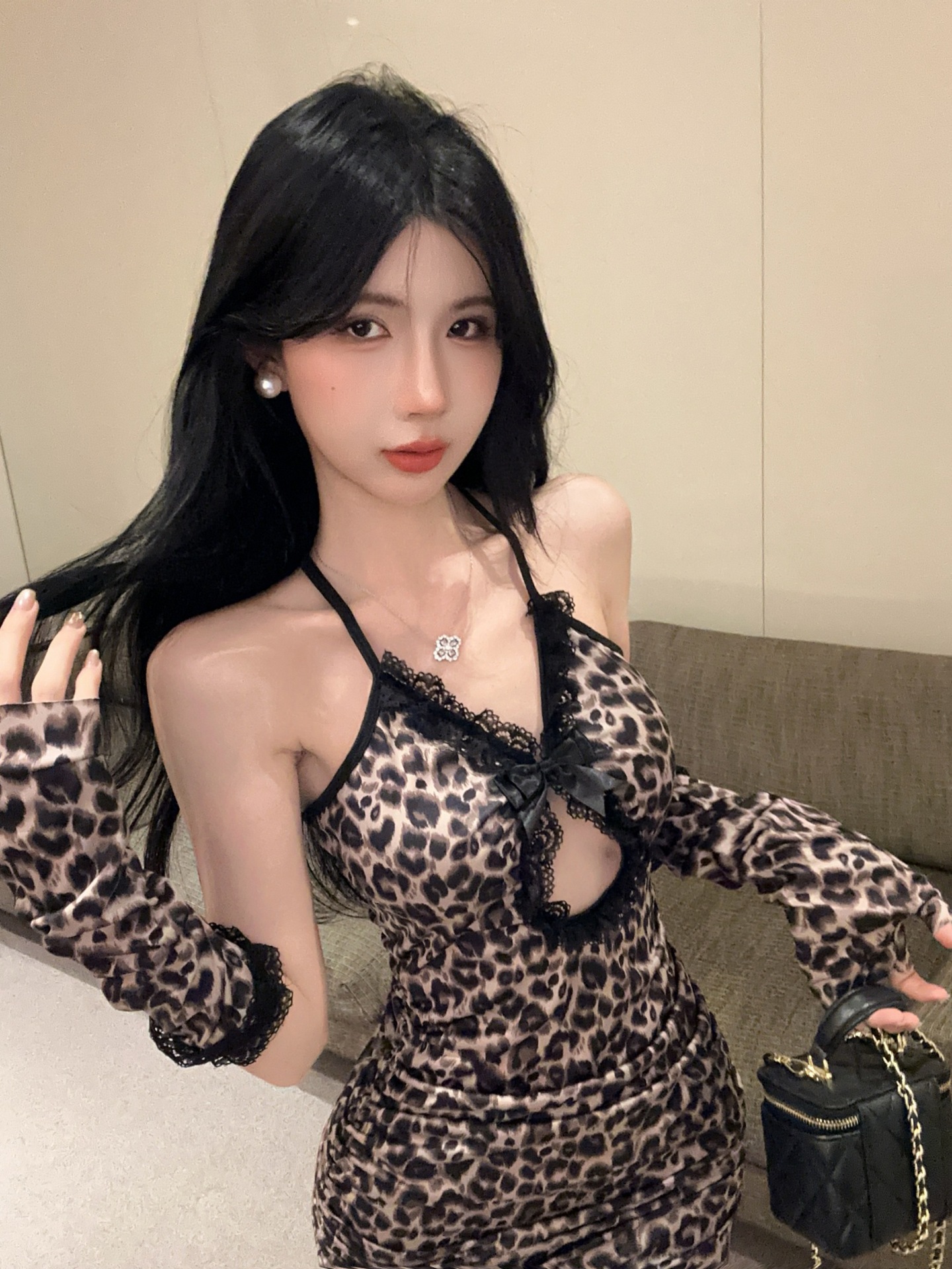 野性豹纹热辣包臀挂脖吊带情趣家居睡衣性感蕾丝镂空诱惑连衣裙女