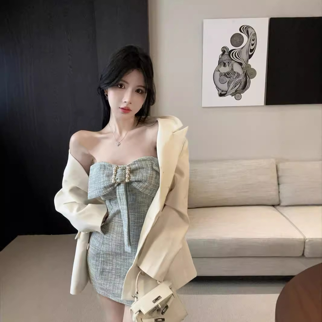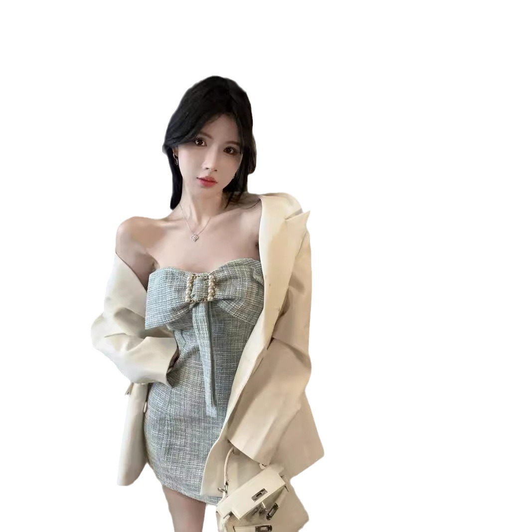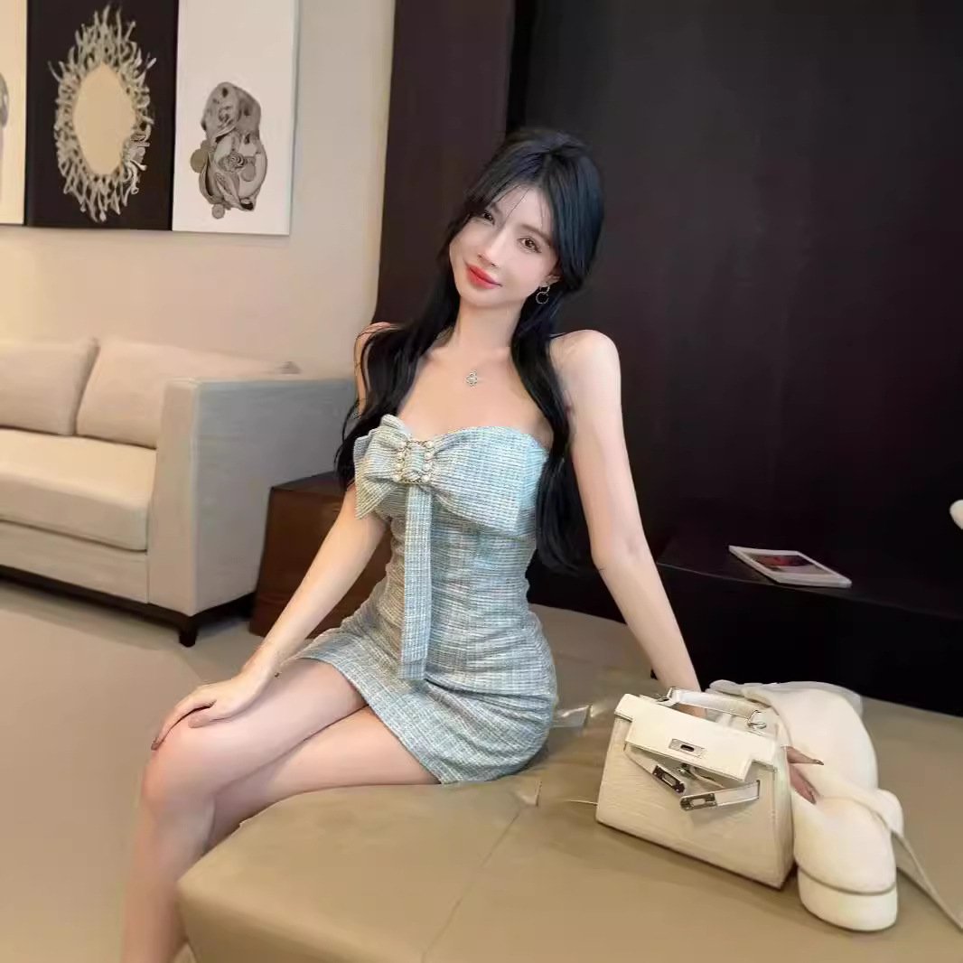 优雅气质设计感蝴蝶结装饰辣妹纯欲性感抹胸显瘦收腰连衣裙短裙女