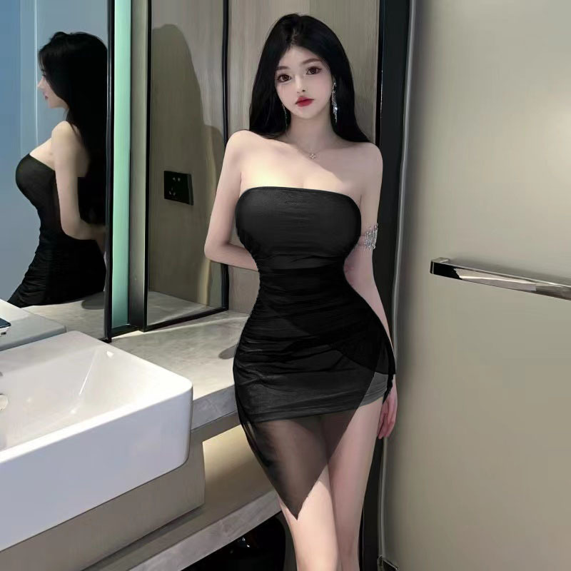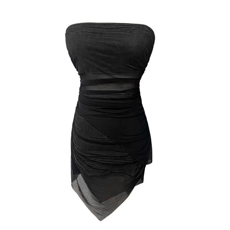 网纱双层透视内衬抹胸礼服性感风辣妹不规则短裙紧身包臀连衣裙女