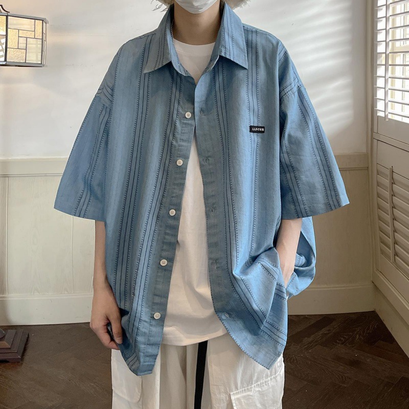 条纹短袖牛仔衬衫男夏季新款复古宽松休闲时尚百搭单排扣上衣
