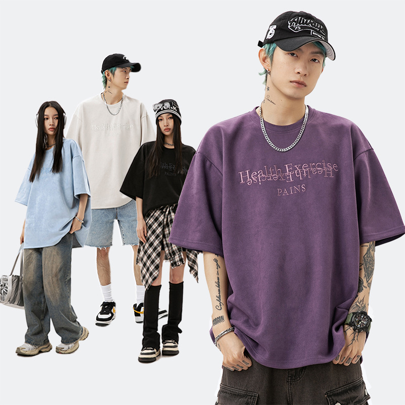 复古质感麂皮绒短袖T恤男女同款春夏季潮牌刺绣字母高街美式体恤