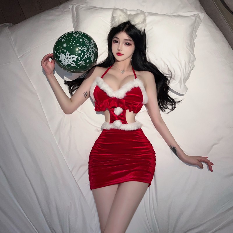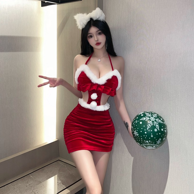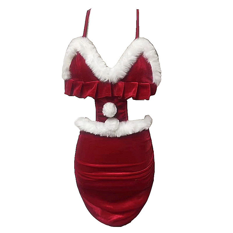 性感cos红色拼接圣诞主播同款修身包臀短裙露背新年女神连衣裙女