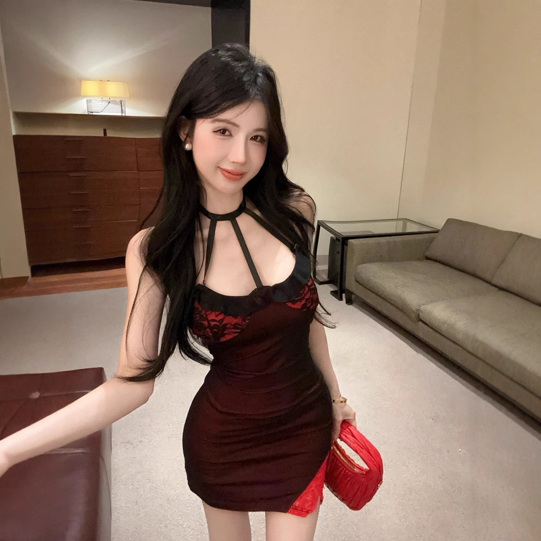 设计感镂空吊带无袖纯欲御姐网纱性感夜店辣妹紧身包臀开叉连衣裙