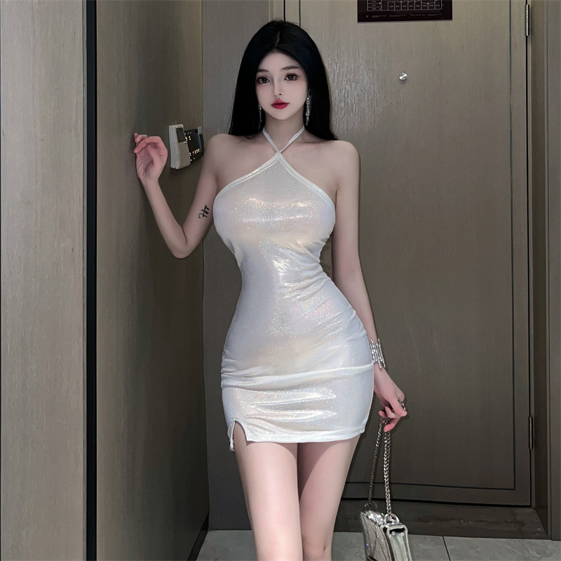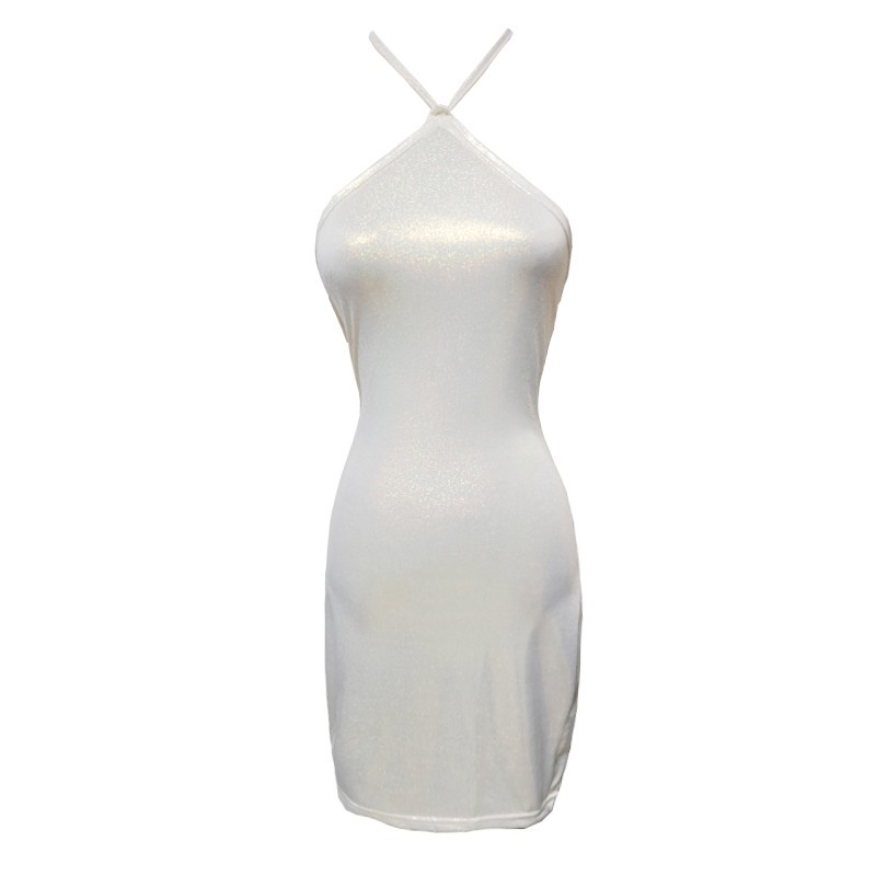 欧美性感纯欲夜店挂脖露背亮面紧身包臀连衣裙女