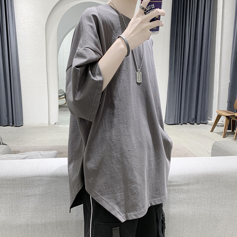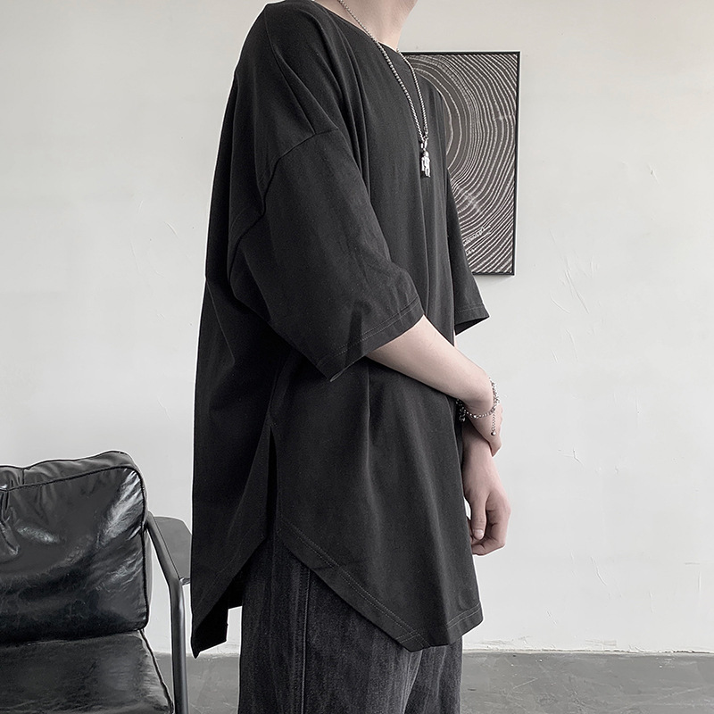 短袖t恤男夏季宽松纯棉日系潮牌ins设计感体恤下摆开叉落肩五分袖