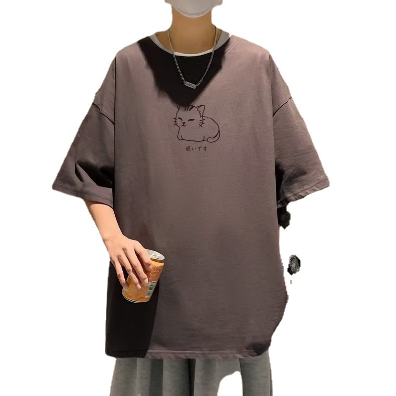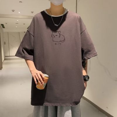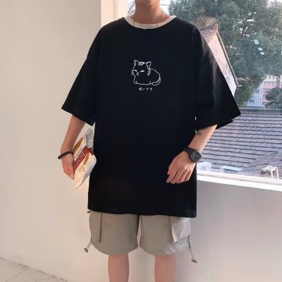 猫咪印花短袖T恤男夏季休闲简约百搭上衣胖子大码宽松潮牌ins体恤