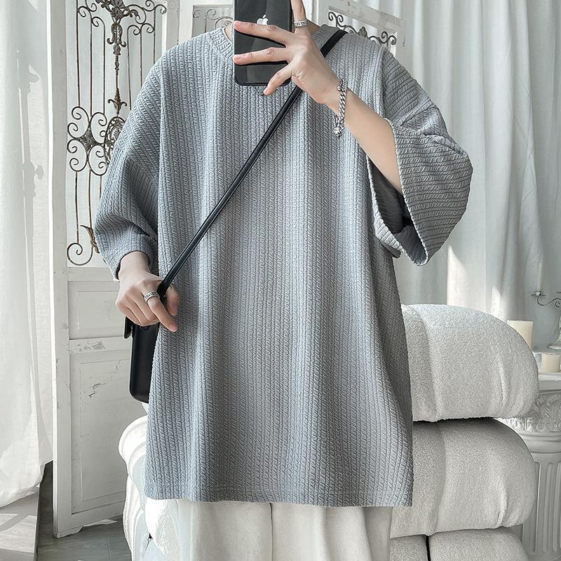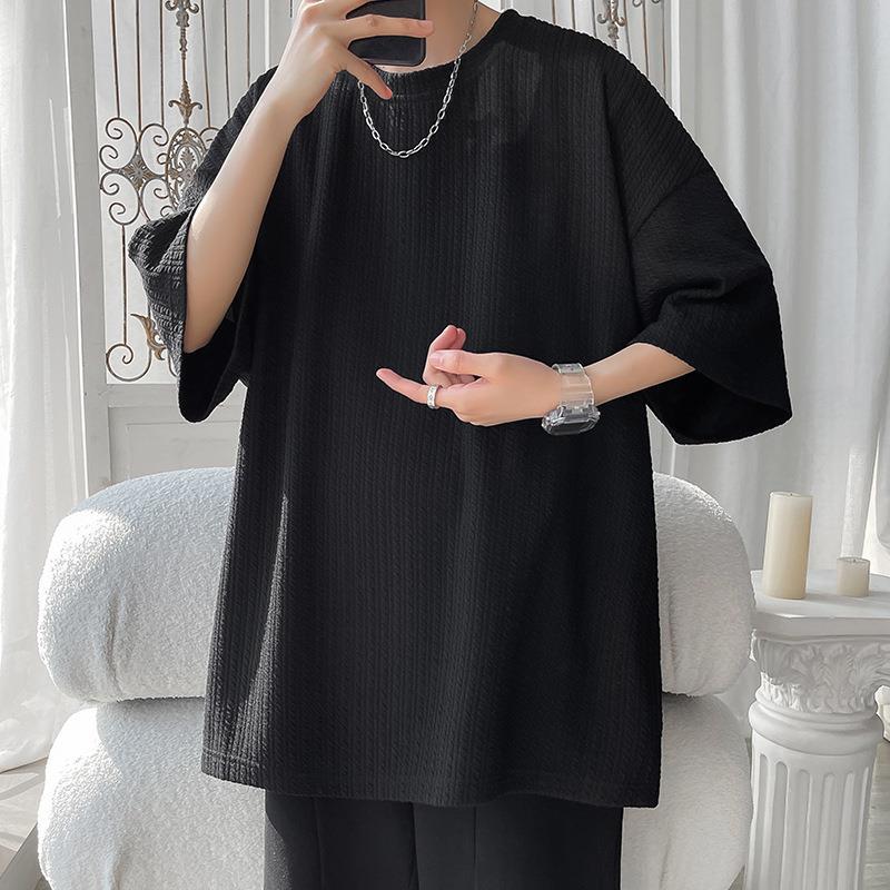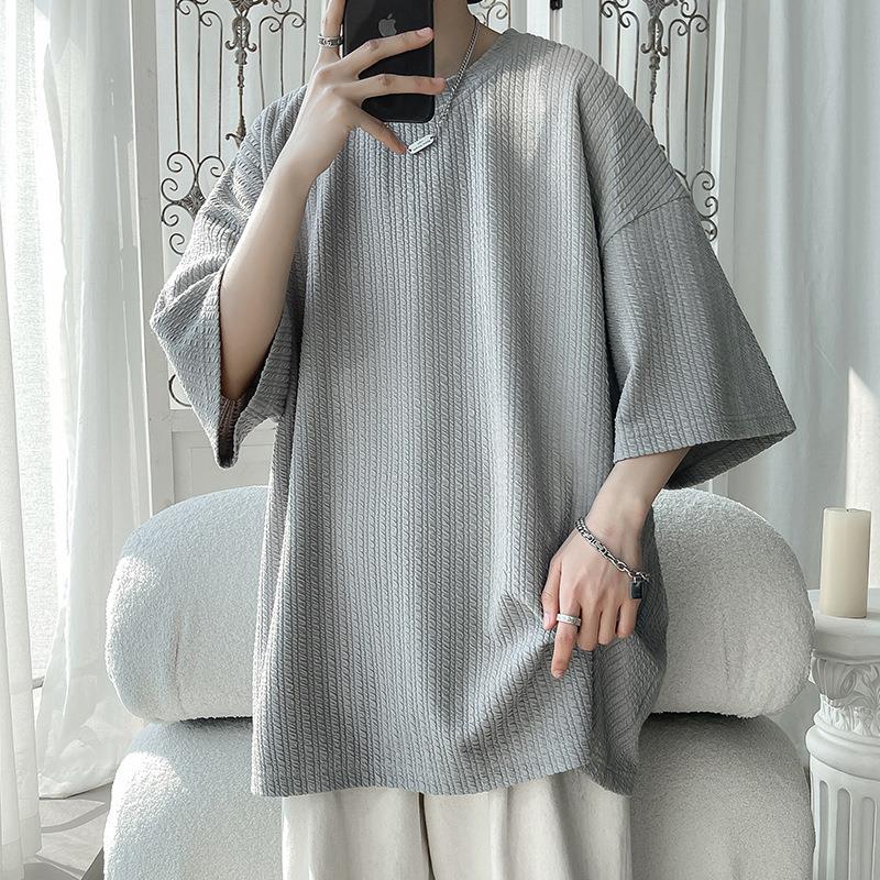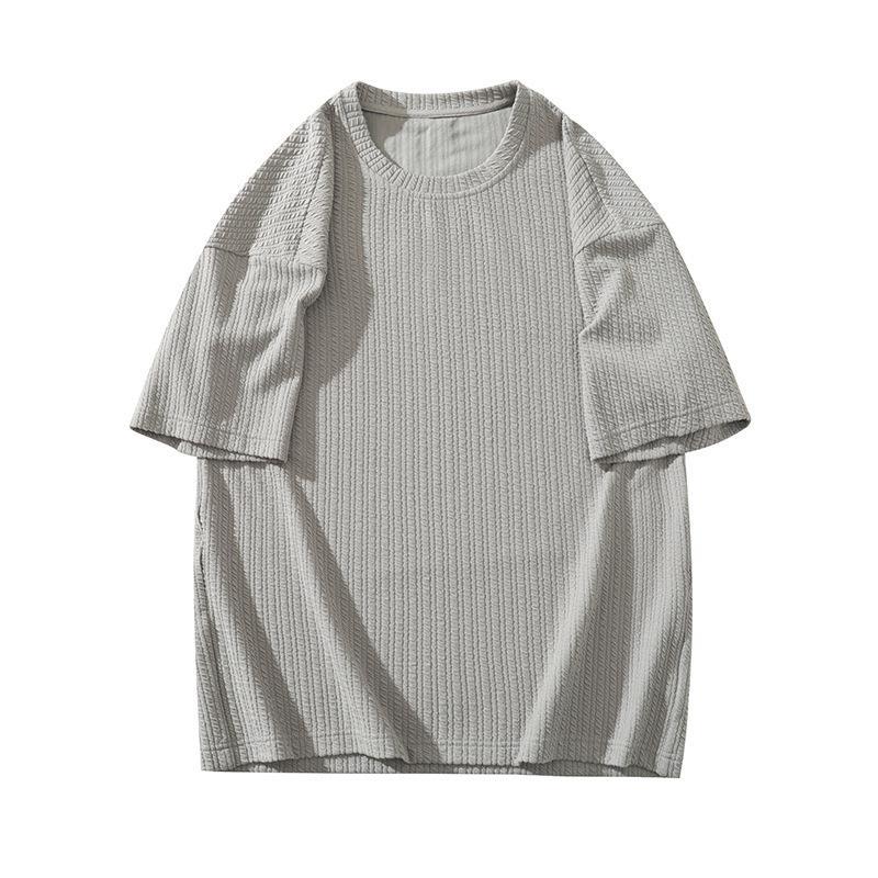 华夫格纯色短袖T恤男生夏季薄款简约潮流五分袖体恤宽松大码半袖