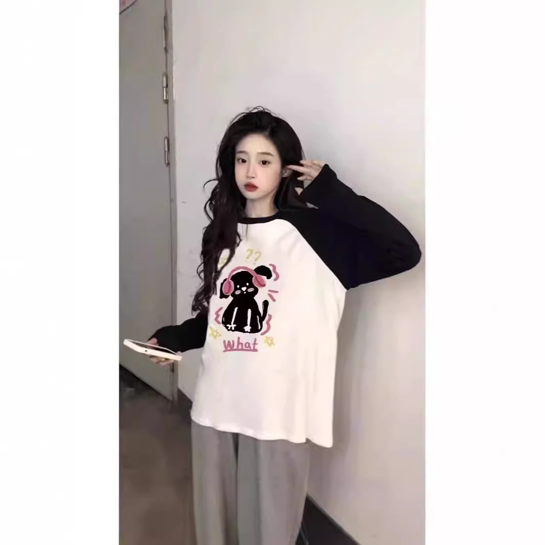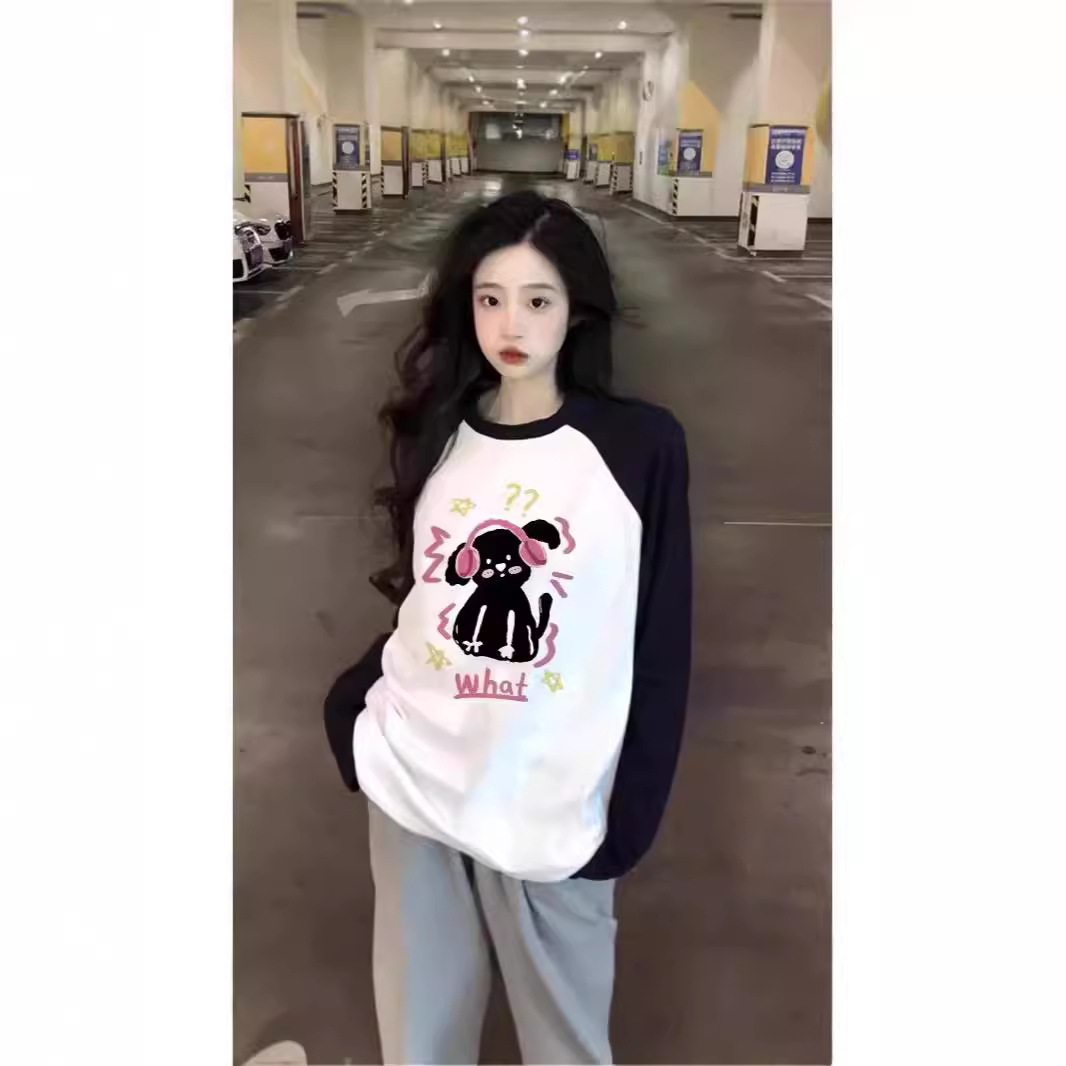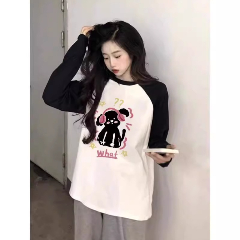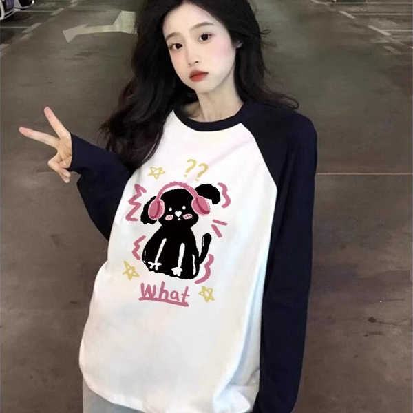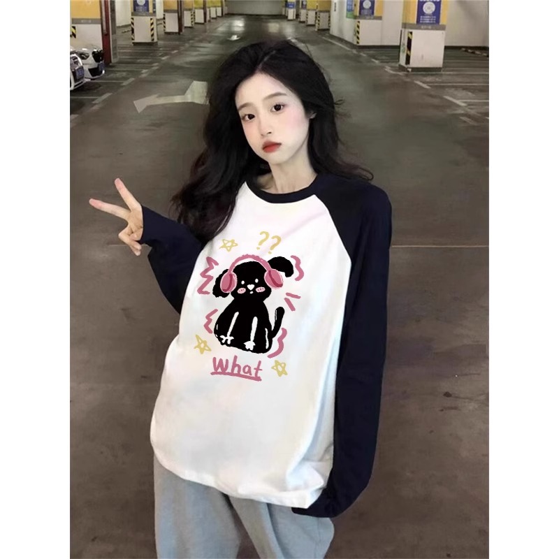 បូកទំហំកប្បាស color-blocked raglan sleeve អាវយឺតដៃវែង ការរចនាពិសេសរបស់ស្ត្រីរដូវស្លឹកឈើជ្រុះ អារម្មណ៍ថា ខោអាវរលុង ស្រទាប់មូលដ្ឋាន កំពូល