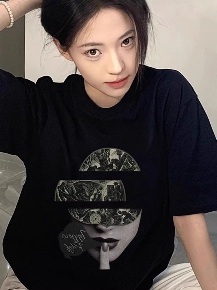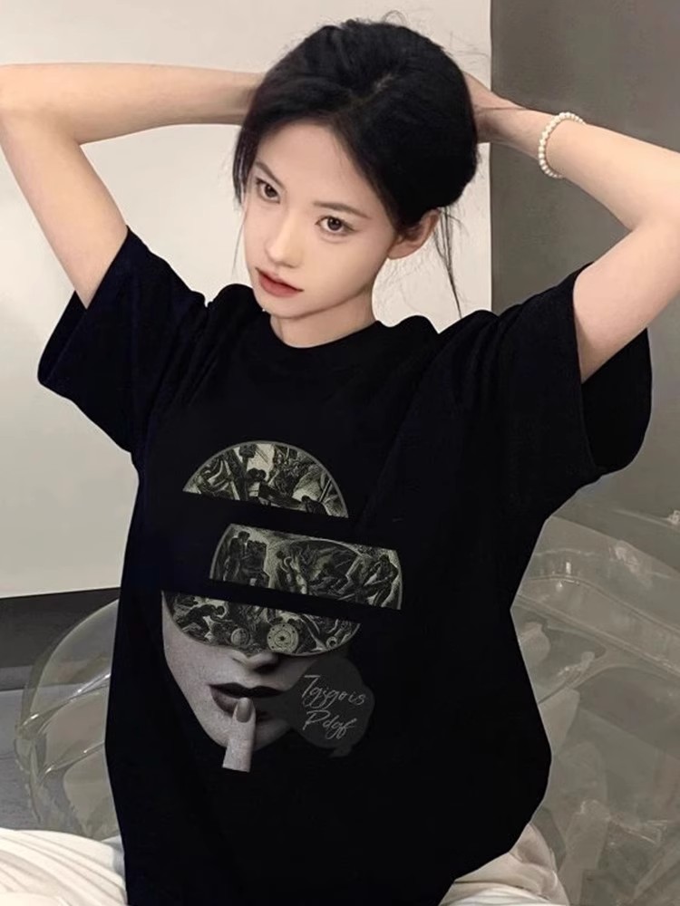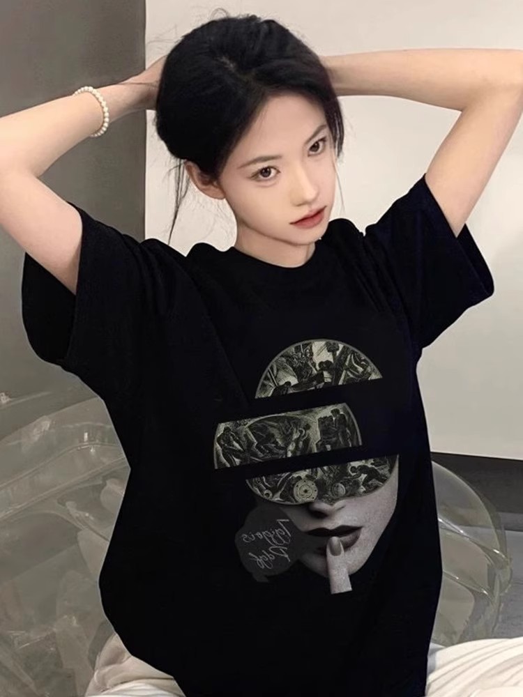 纯棉美式复古街头嘻哈人脸印花短袖T恤女夏季宽松大码潮牌上衣服