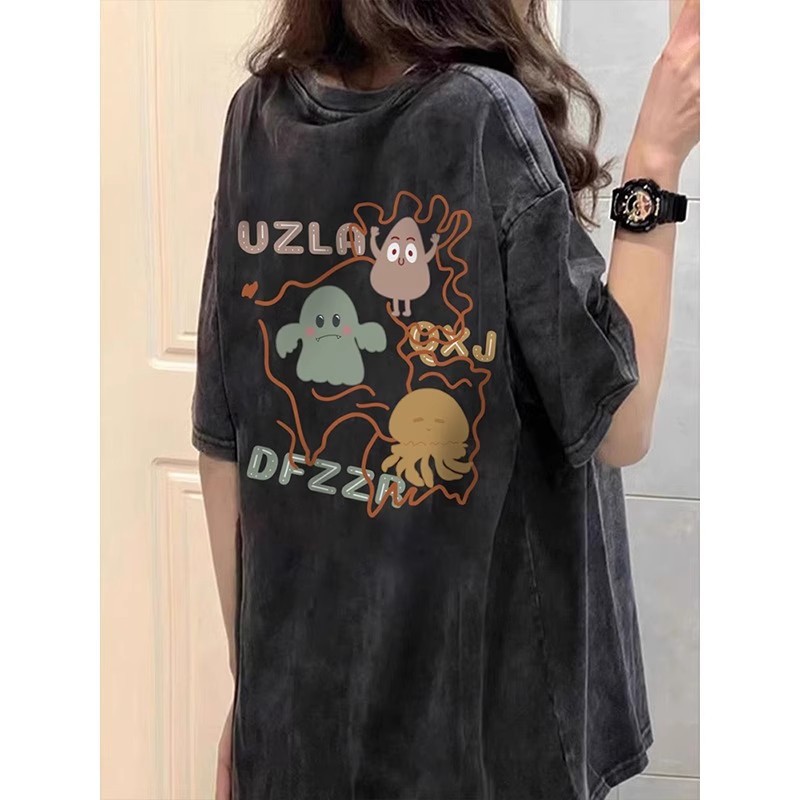 欧美复古正肩短袖t恤男女夏季设计感小众宽松水洗高街ins情侣体恤