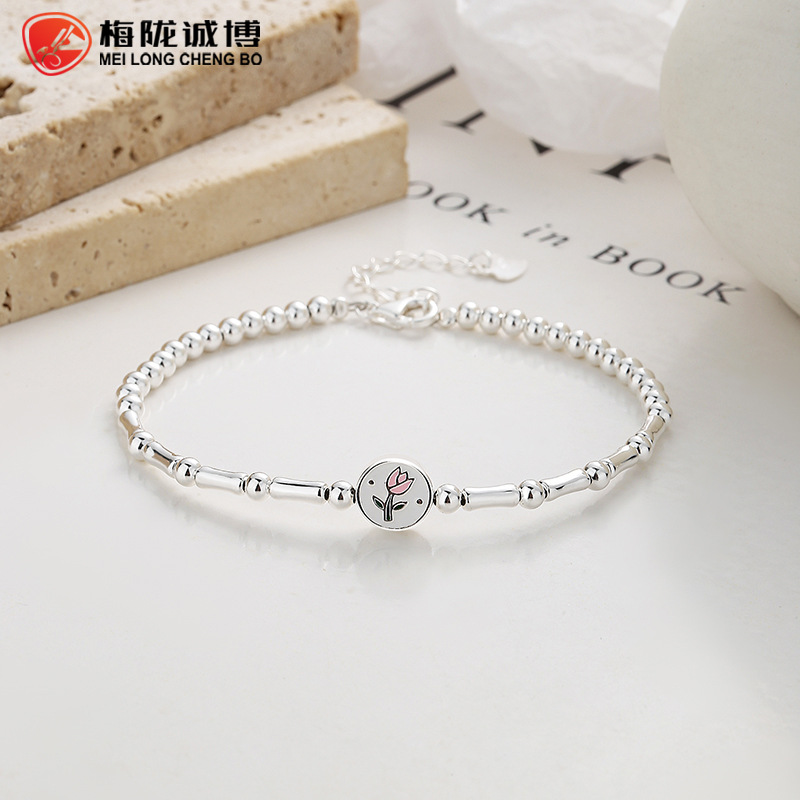 925纯银郁金香小圆牌手链女新款小清新花朵手链高级感ins气质饰品