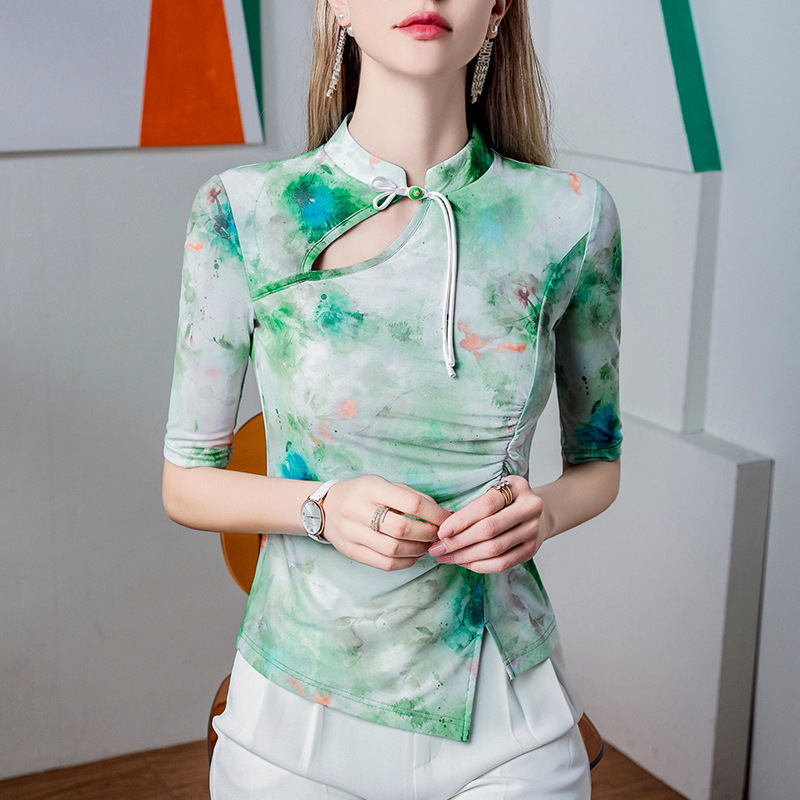 新中式盘扣立领扎染印花上衣女五分袖夏季旗袍领中袖网纱T恤