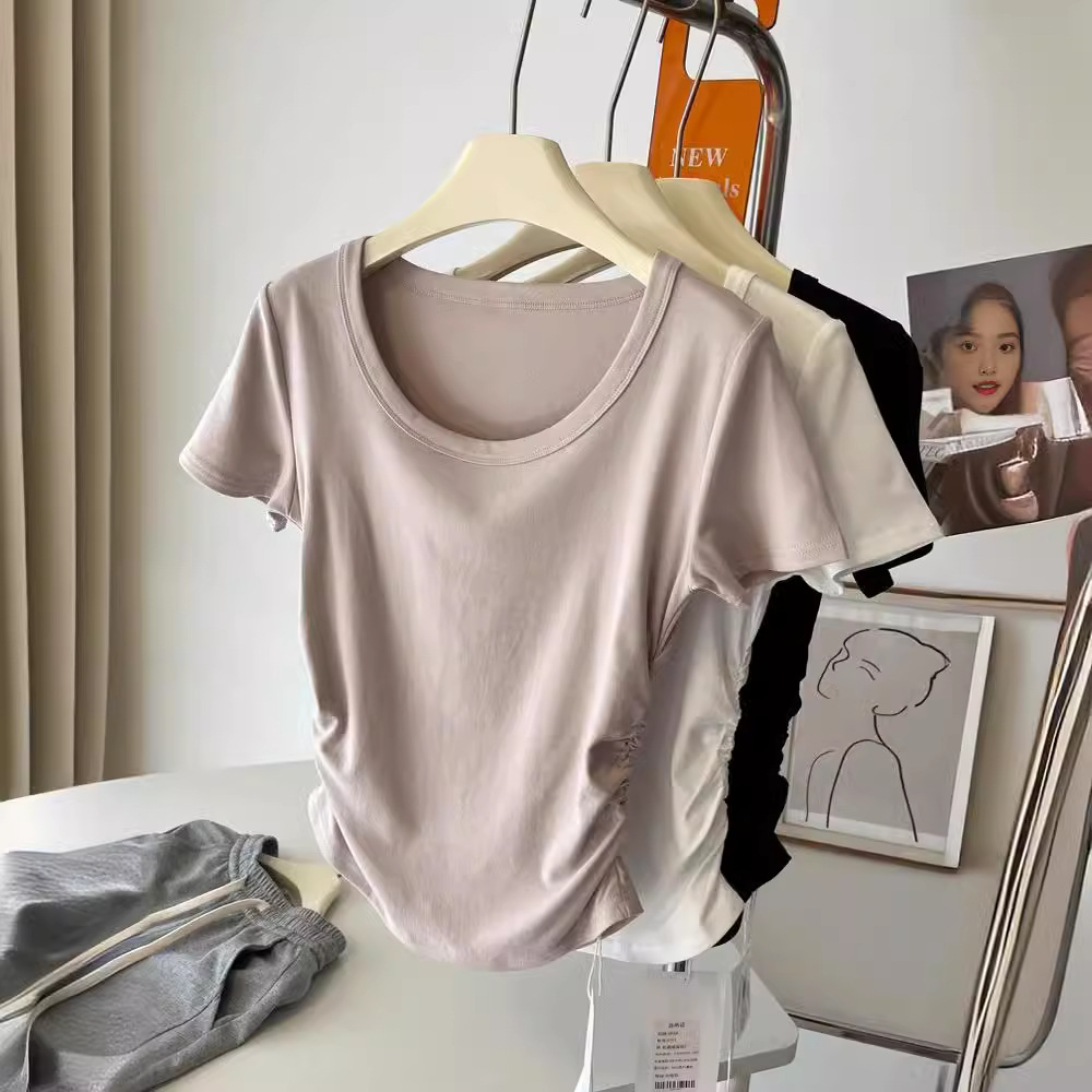 正肩大U领~设计感小众短袖t恤女夏季小个子修身收腰显瘦短款上衣