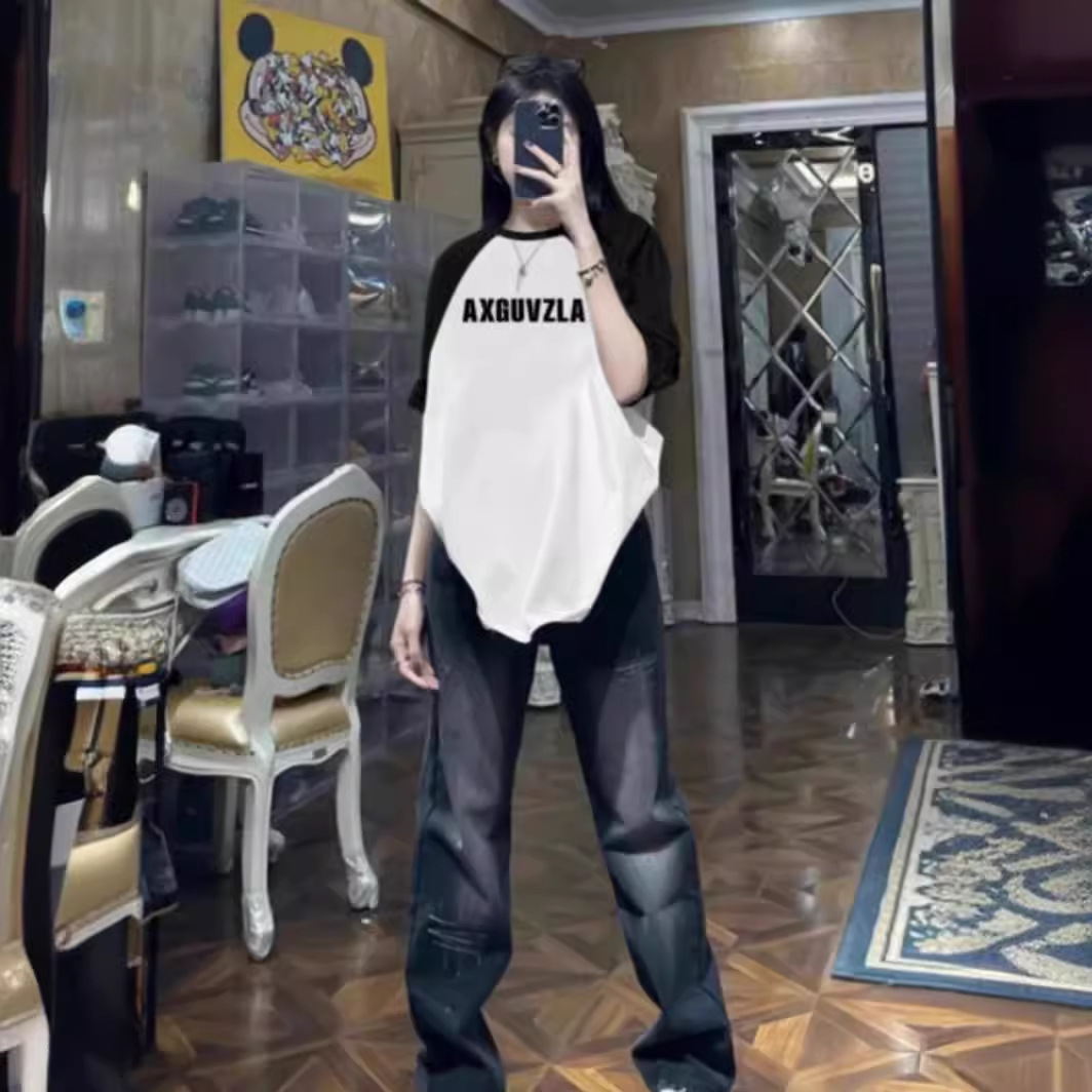 高街圆领拼接撞色设计感T恤夏季新款女小众短款正肩短袖