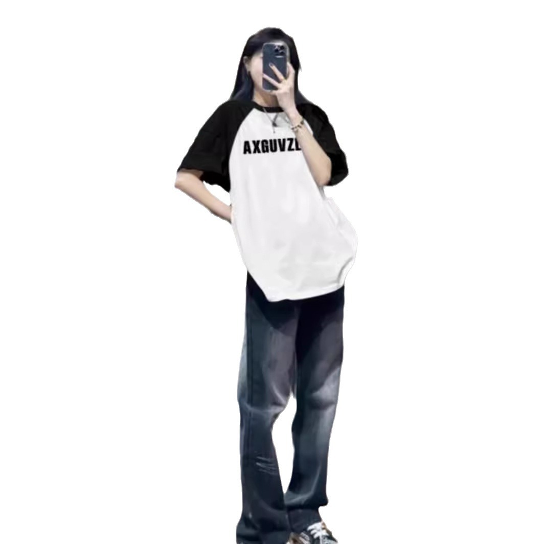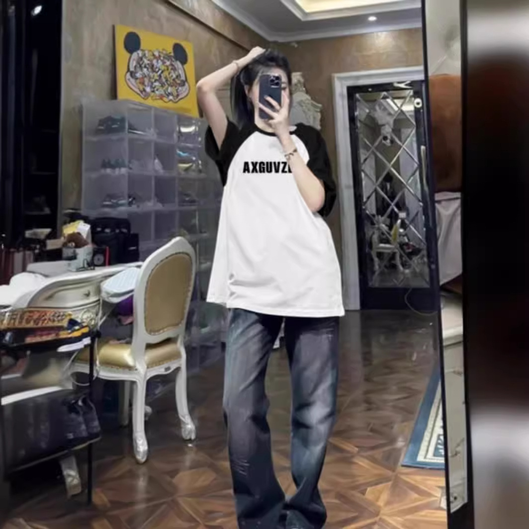 美式oversize插肩短袖t恤女夏季新款复古国潮宽松情侣上衣ins