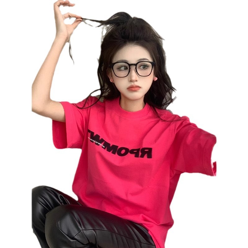 日系火龙果色短袖女夏季新款宽松纯棉半袖t恤oversize潮牌上衣ins