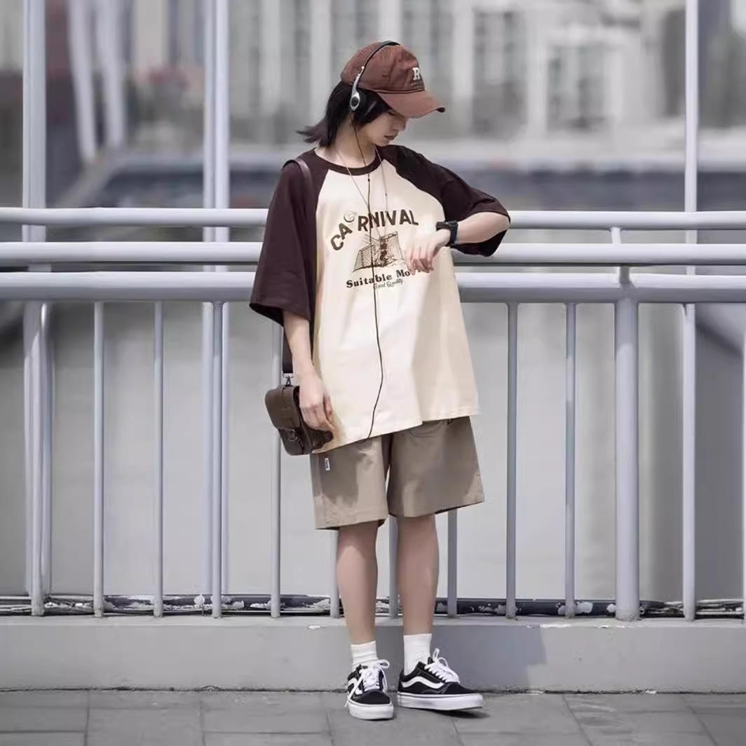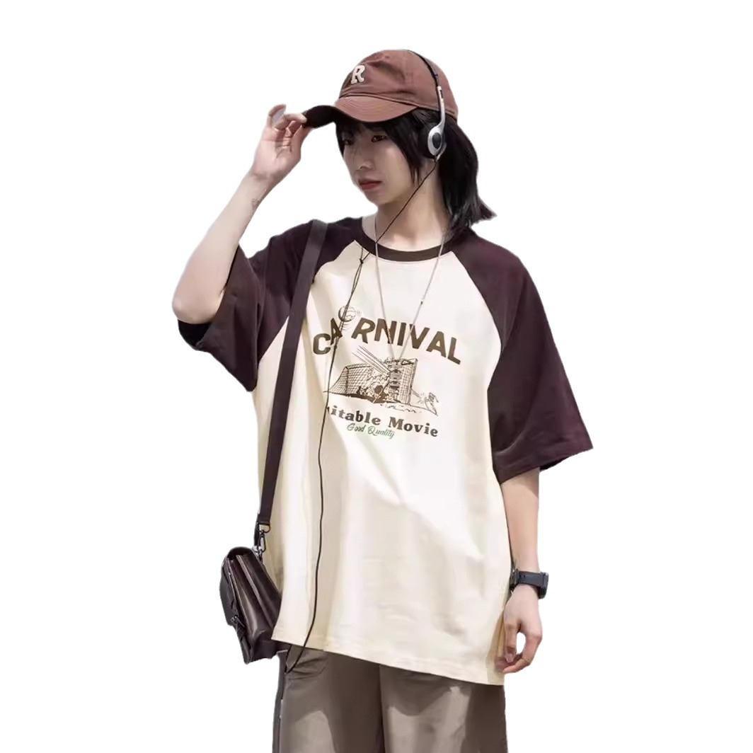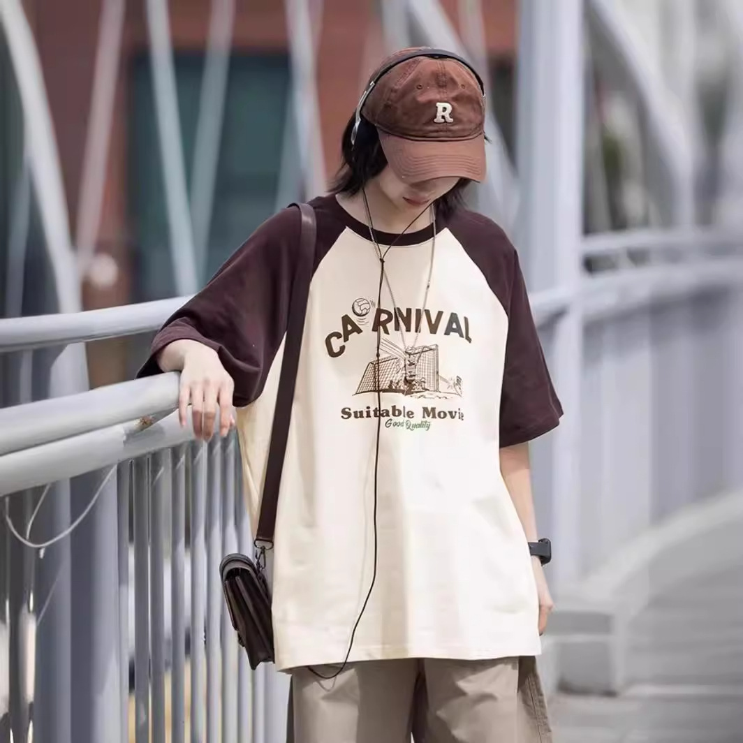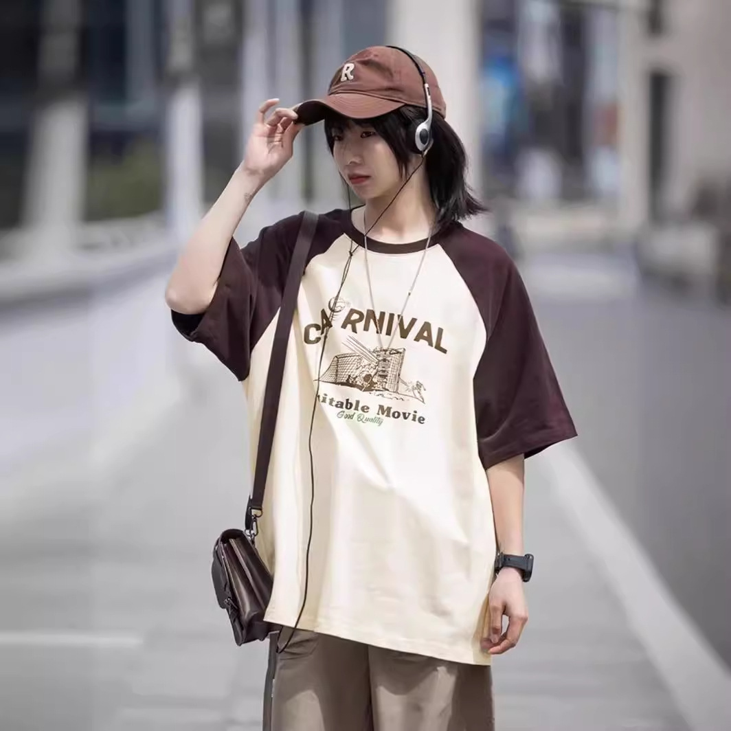 美式复古慵懒风chic插肩袖t恤男女春夏新款小个子宽松大码圆领上