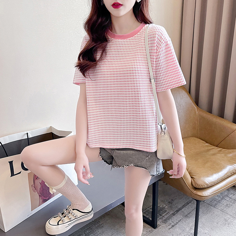 夏季新款短袖减龄粉色格子圆领上衣服小众正肩条纹T恤女ins潮