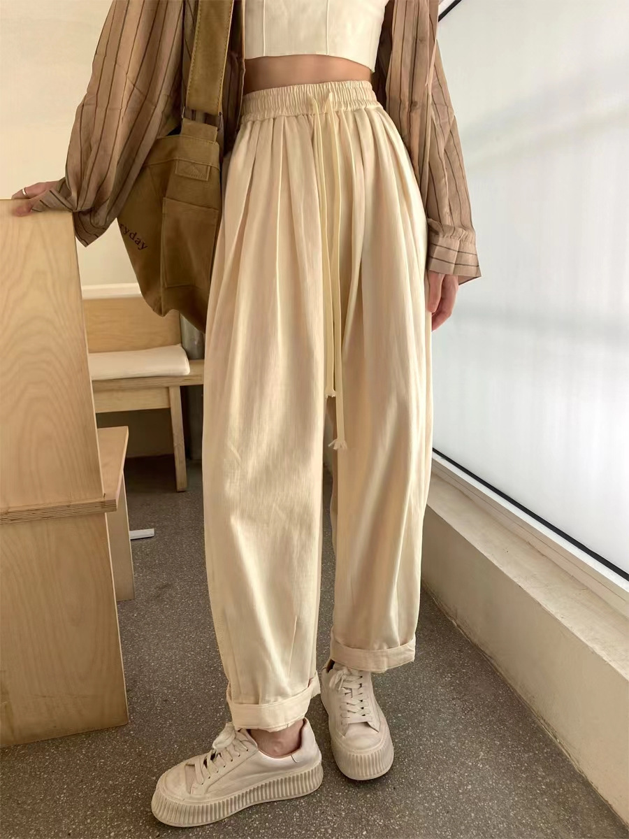米白色工装裤女夏秋高腰酵洗棉日系宽松灯笼萝卜裤休闲直筒阔腿裤