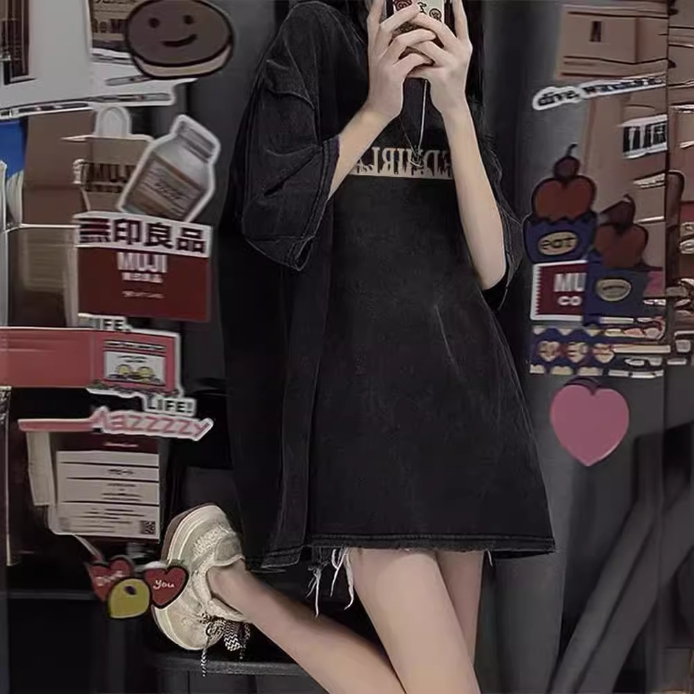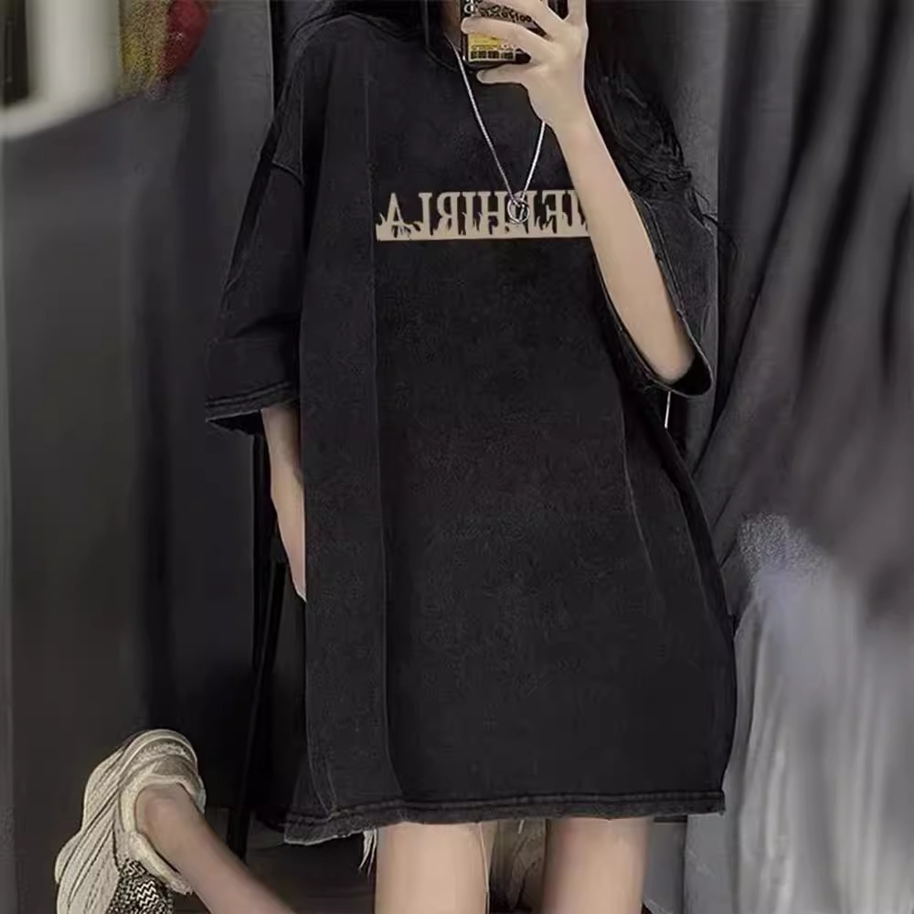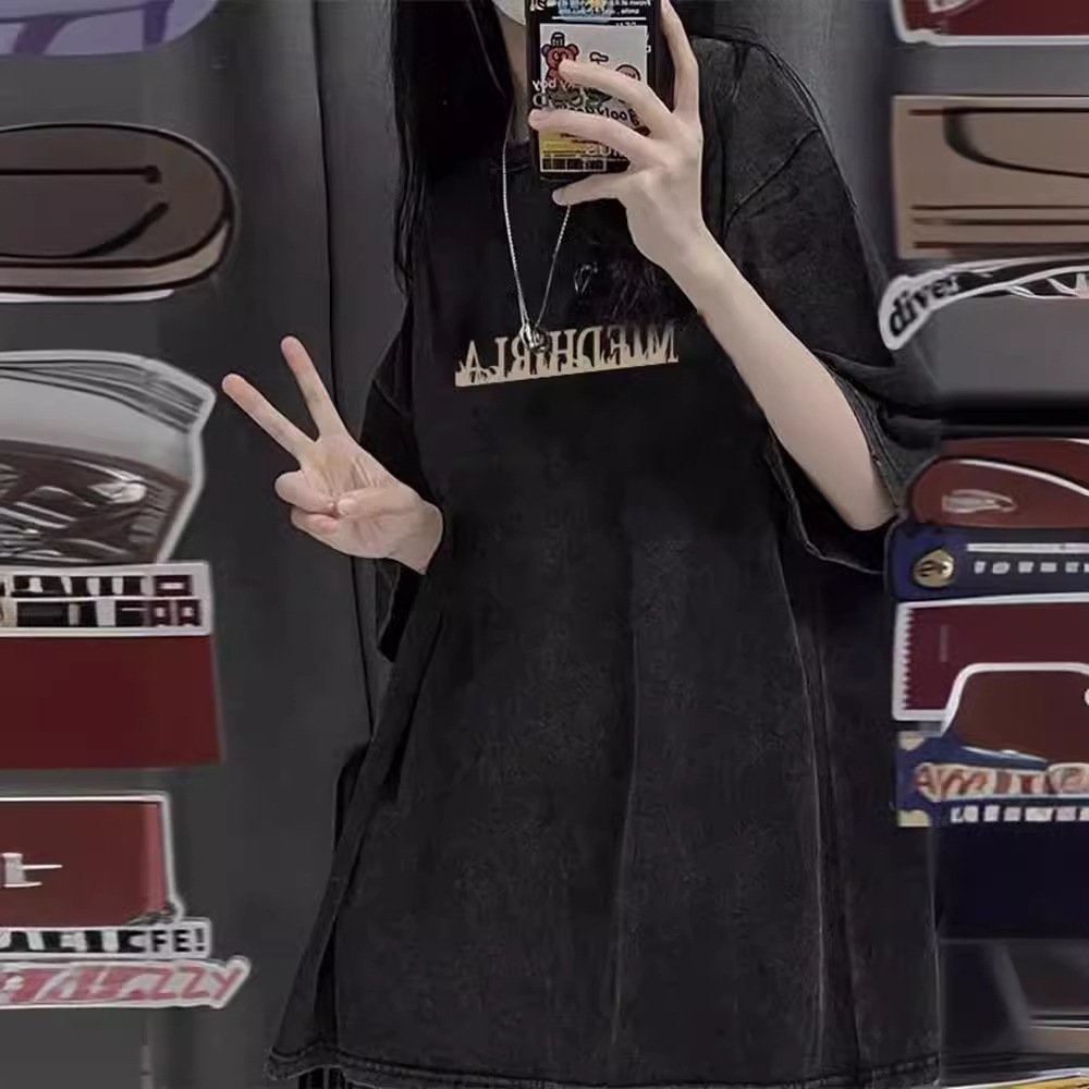欧美潮牌高级感夏季纯棉短袖复古做旧水洗黑T恤女情侣装半袖上衣