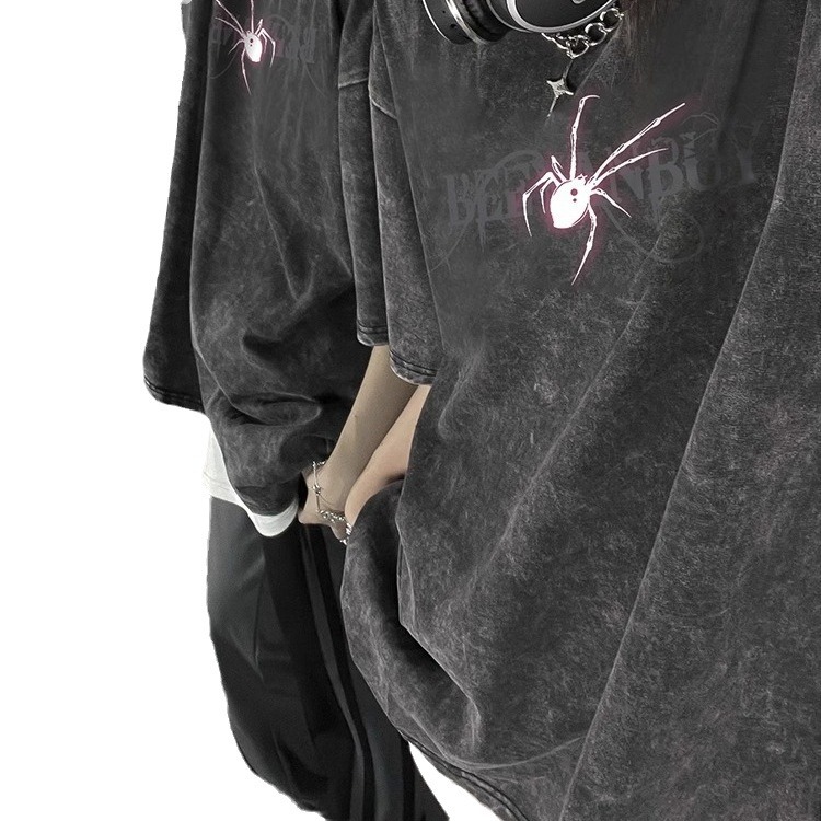 重磅纯棉美式高街蜘蛛印花半袖上衣男女春夏水洗做旧情侣短袖t恤