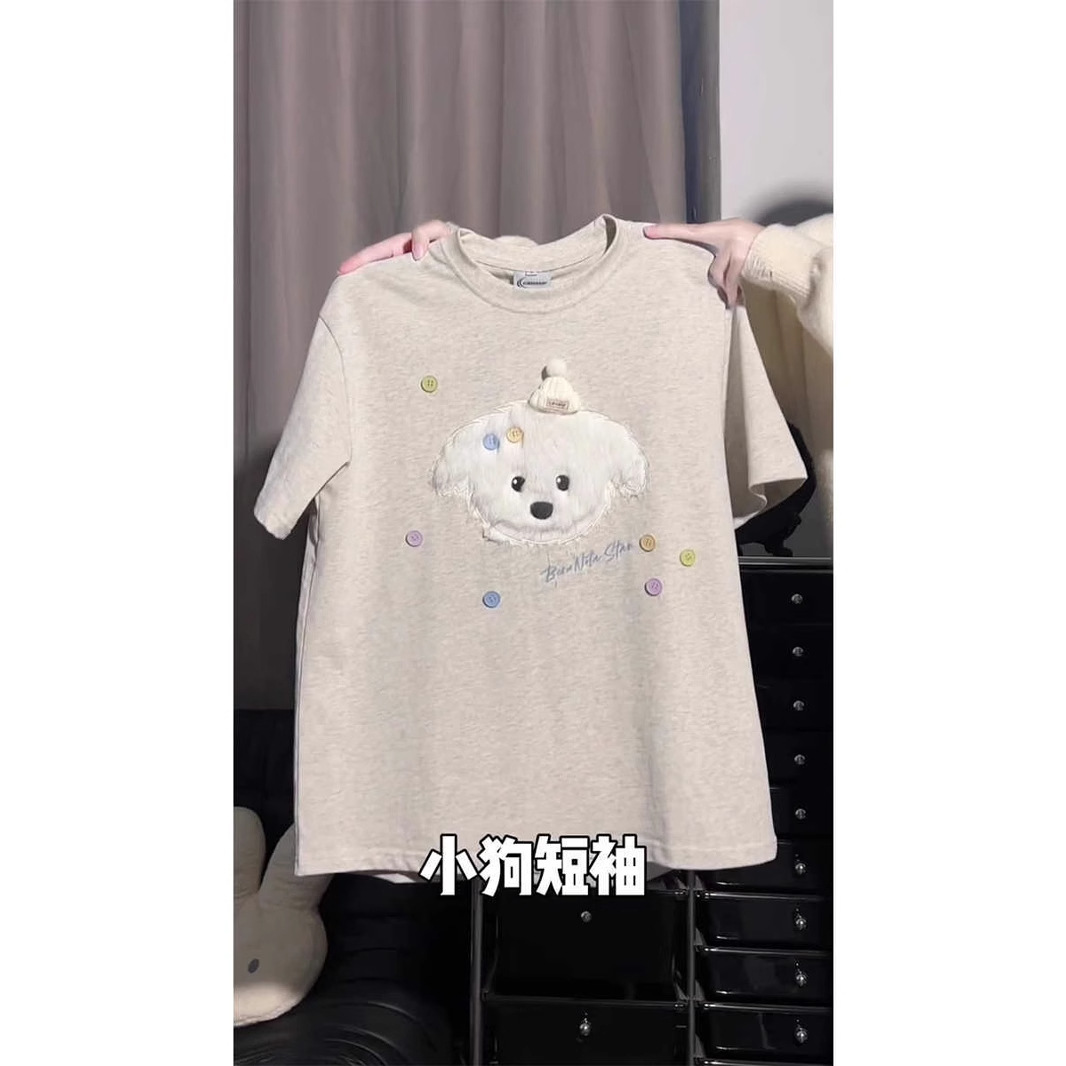 美式复古卡通毛绒小狗纯棉短袖t恤男女潮牌夏季宽松休闲情侣半袖