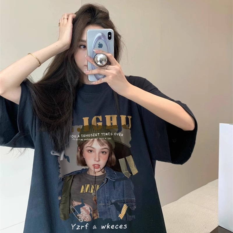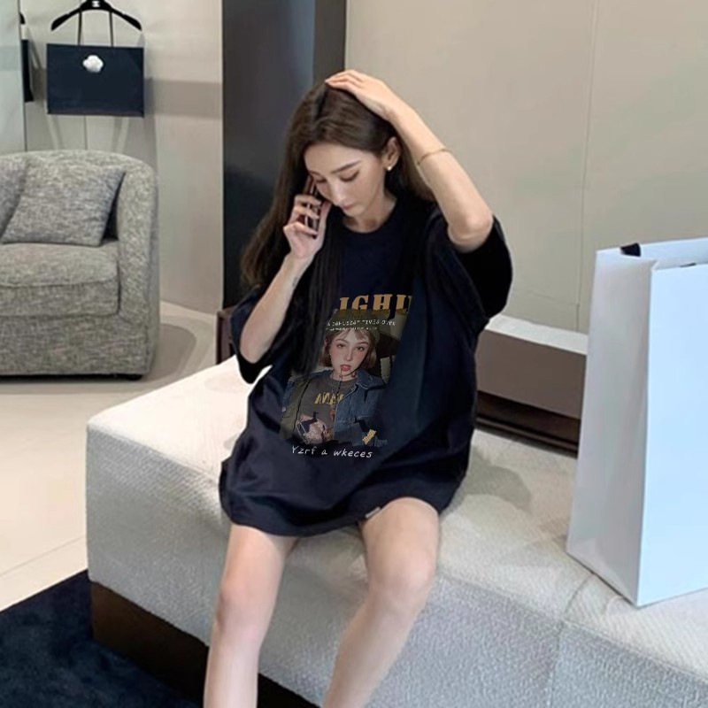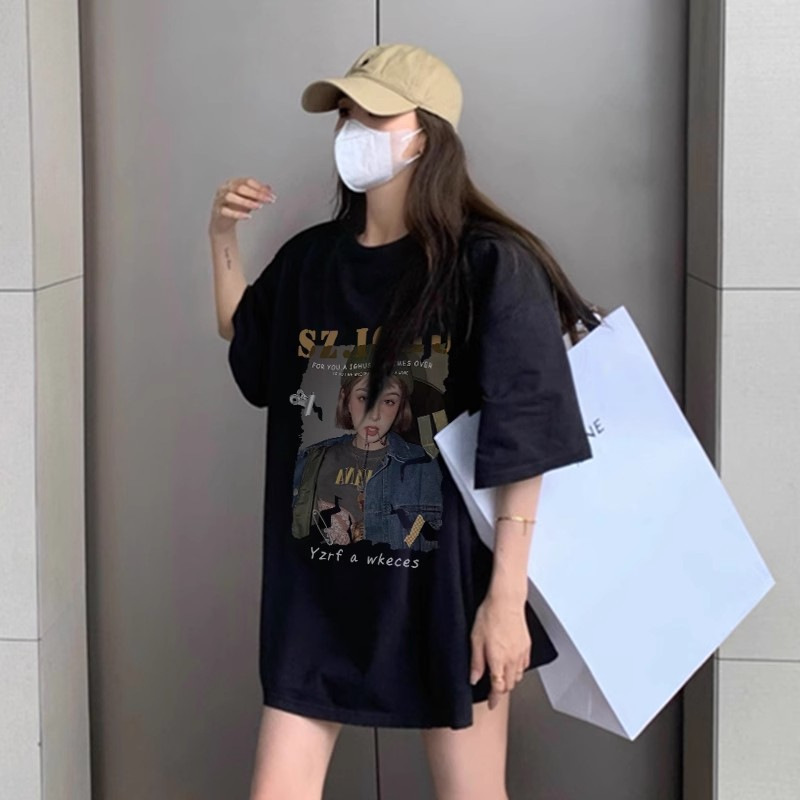 日系复古动漫印花黑色短袖T恤女夏季新款宽松上衣