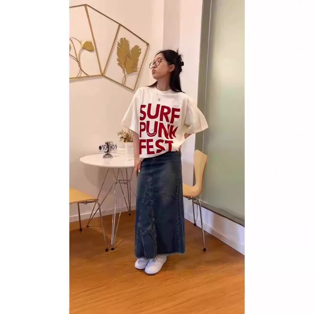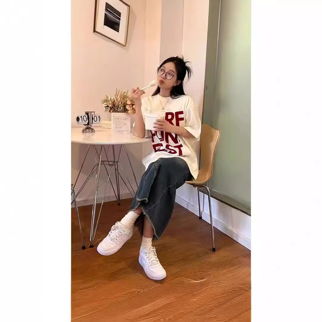 美式高街短袖女夏季文字印花重磅纯棉t恤宽松情侣体恤五分袖上衣