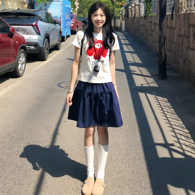 藏青色日系短裙女夏季新款高腰显瘦a字裙宽松休闲百搭压褶半身裙